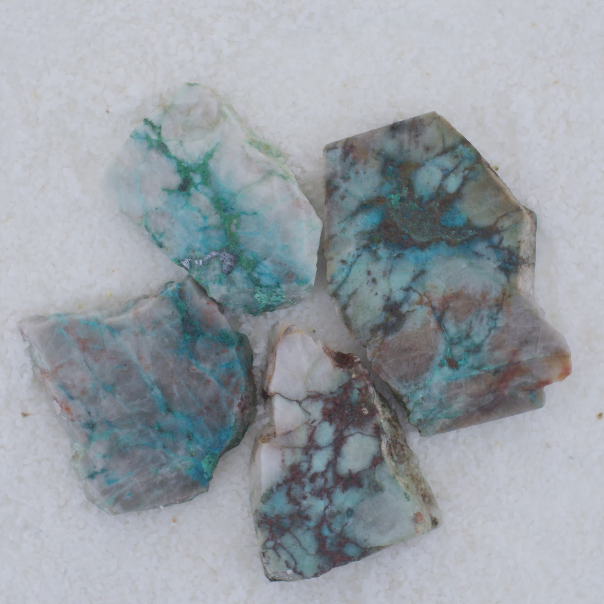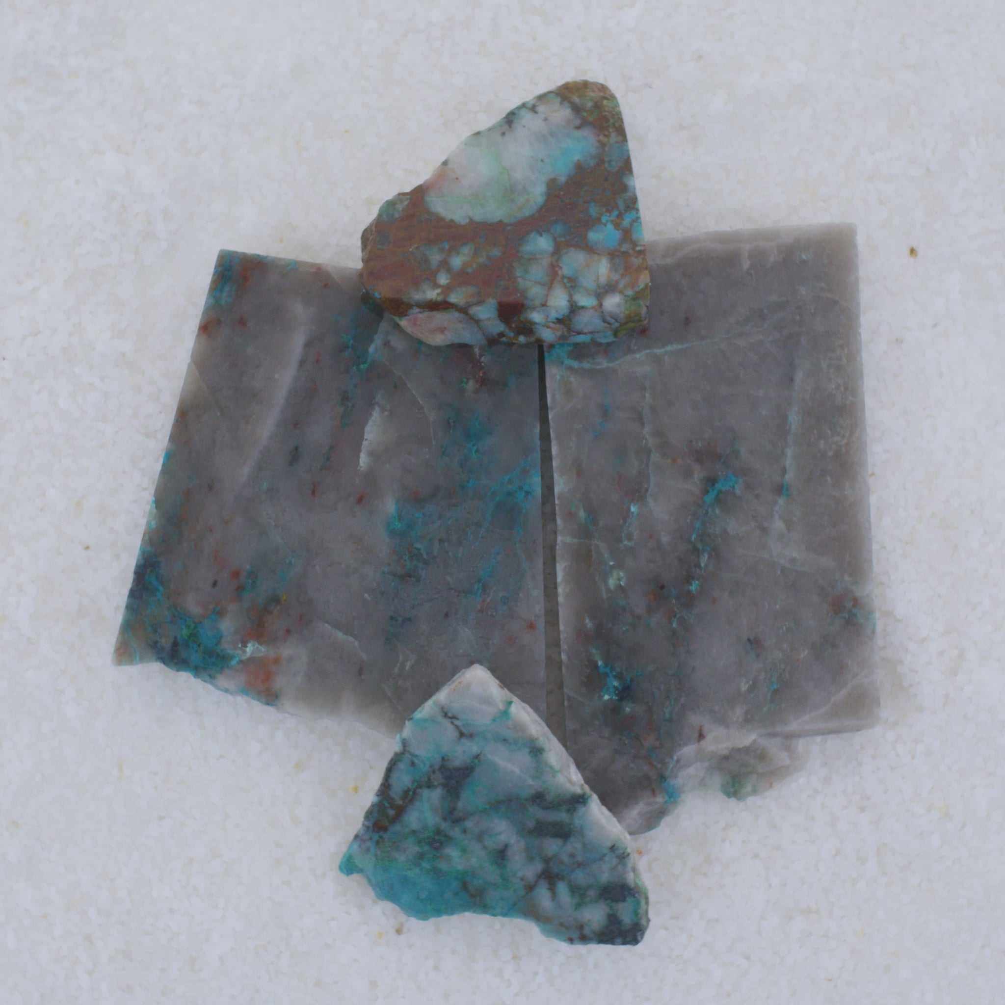 SOLD Blue and green marbled Canyonite stone on a white background