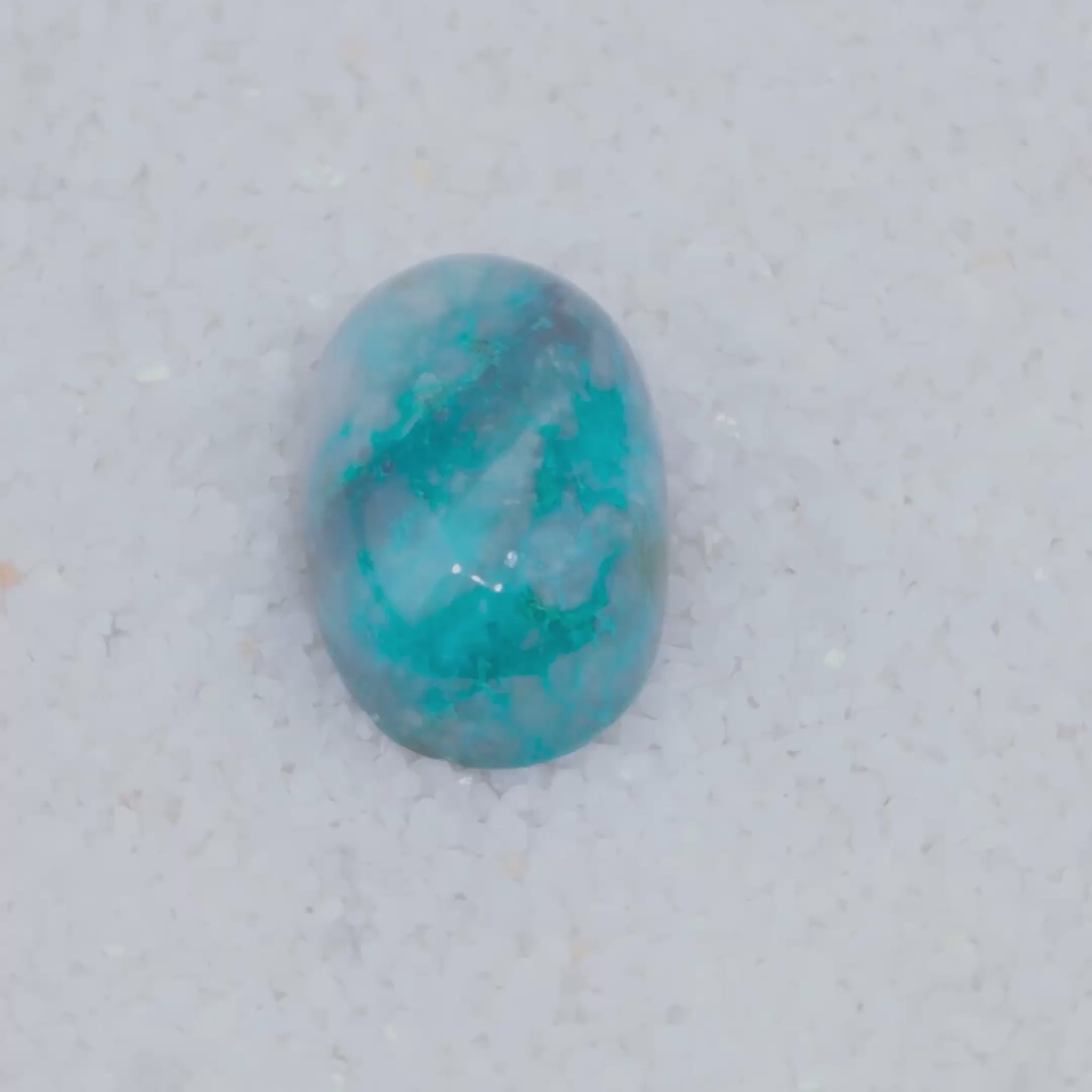 SOLD A polished, oval Canyonite Sky cabochon from Canyonite Sky LTD features marbled teal, blue, and gray swirls. Its glossy blue-green surface rests on smooth white pebbles—a distinctive collector’s gemstone.