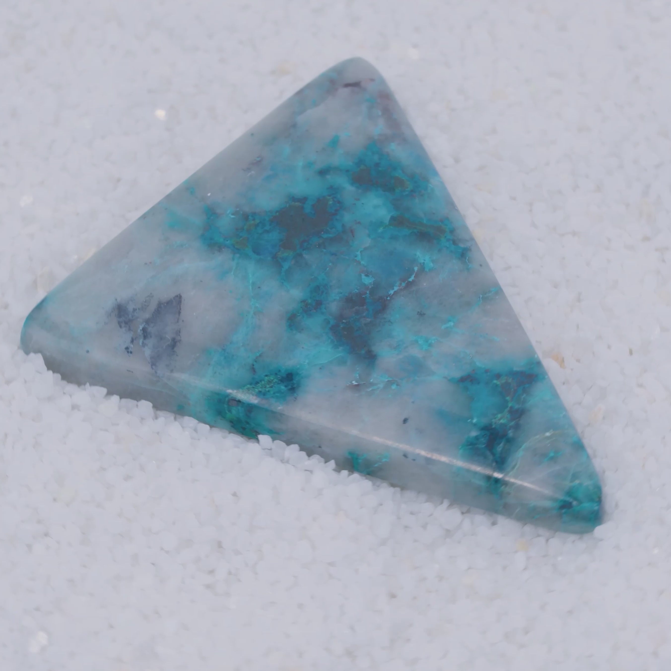 SOLD A rare cabochon from Canyonite Sky LTD, this trapezoidal gemstone features fine white crystals and a gray surface marbled with vibrant blue and teal veins, making it a striking piece for collectors.