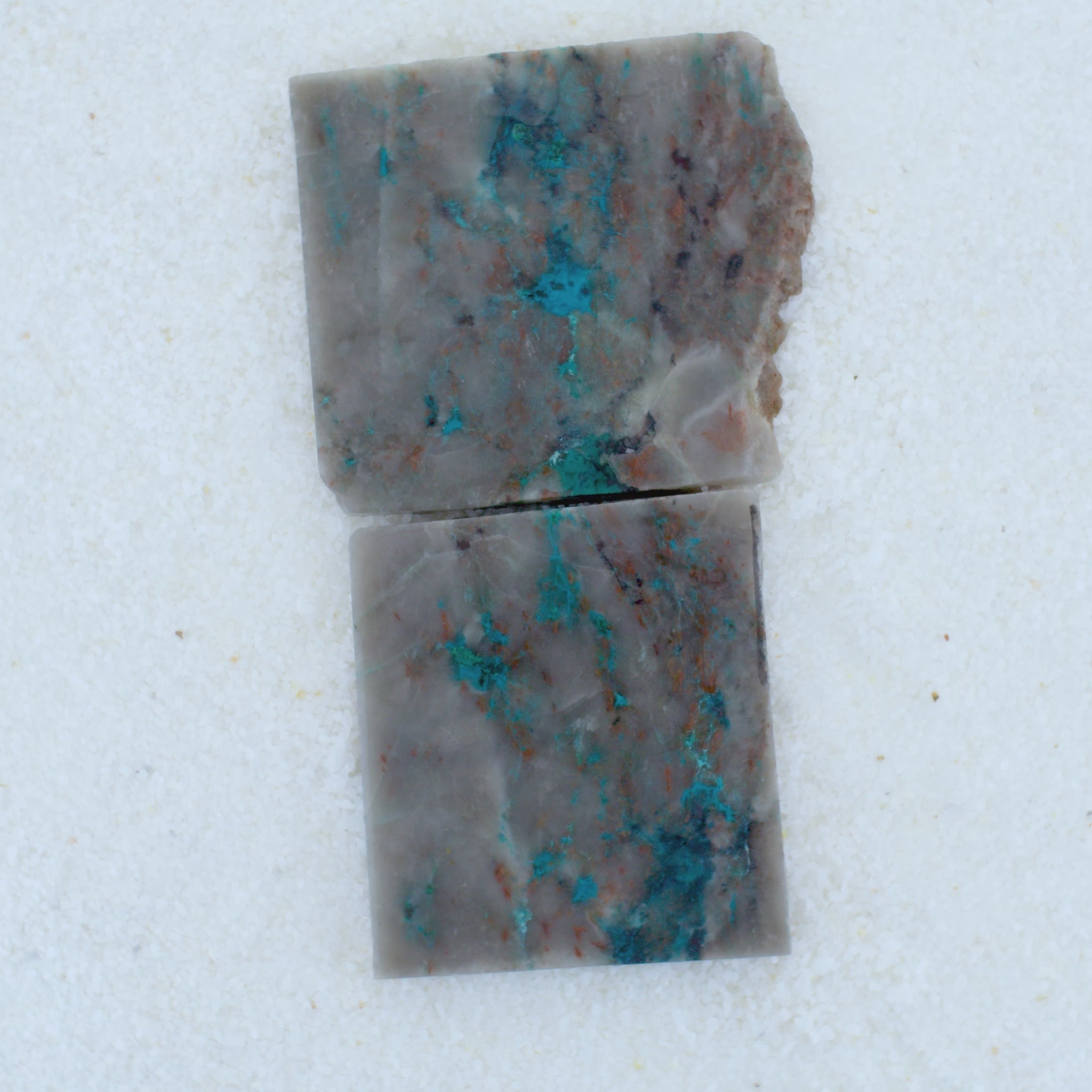 SOLD Rectangular blue stone on a white sandy background