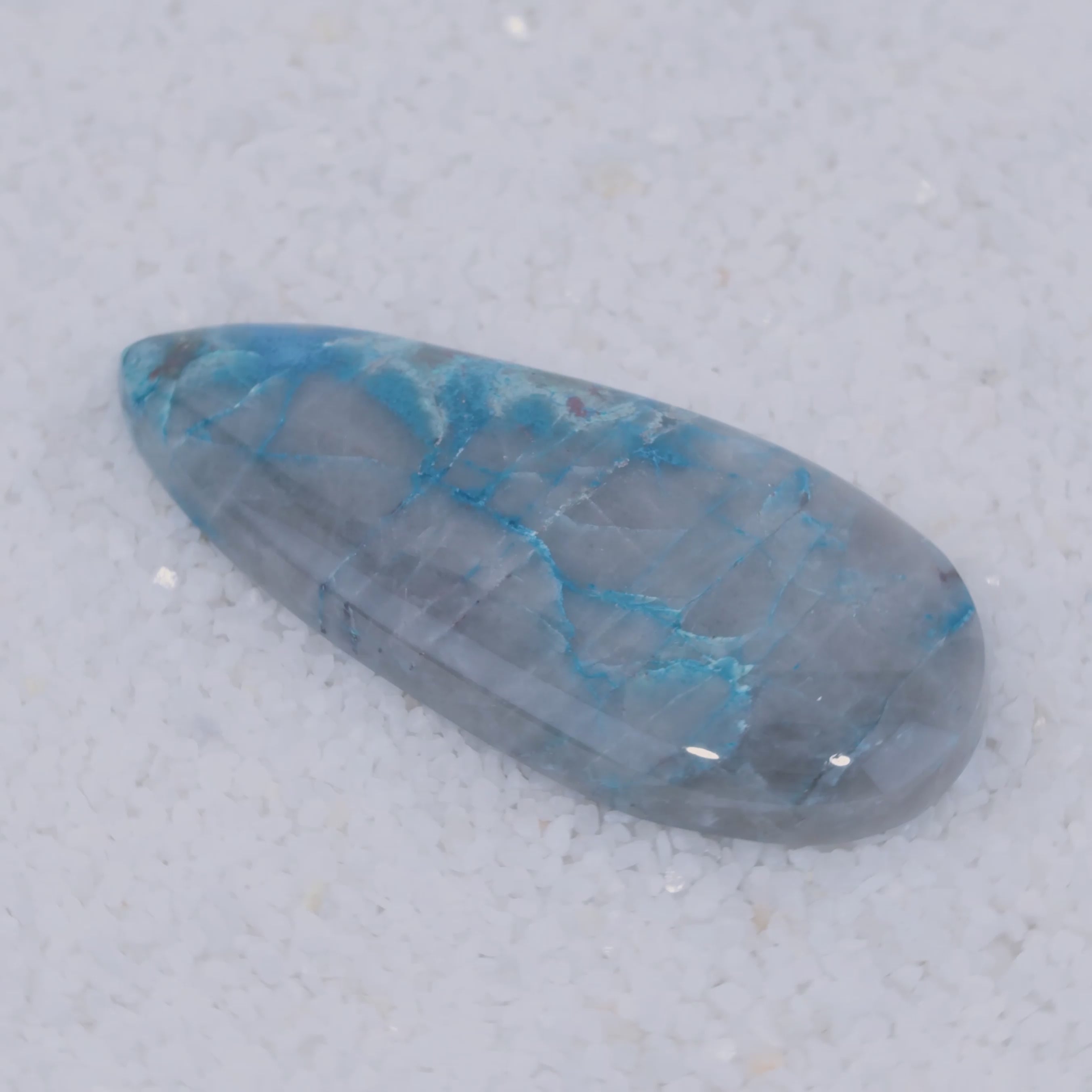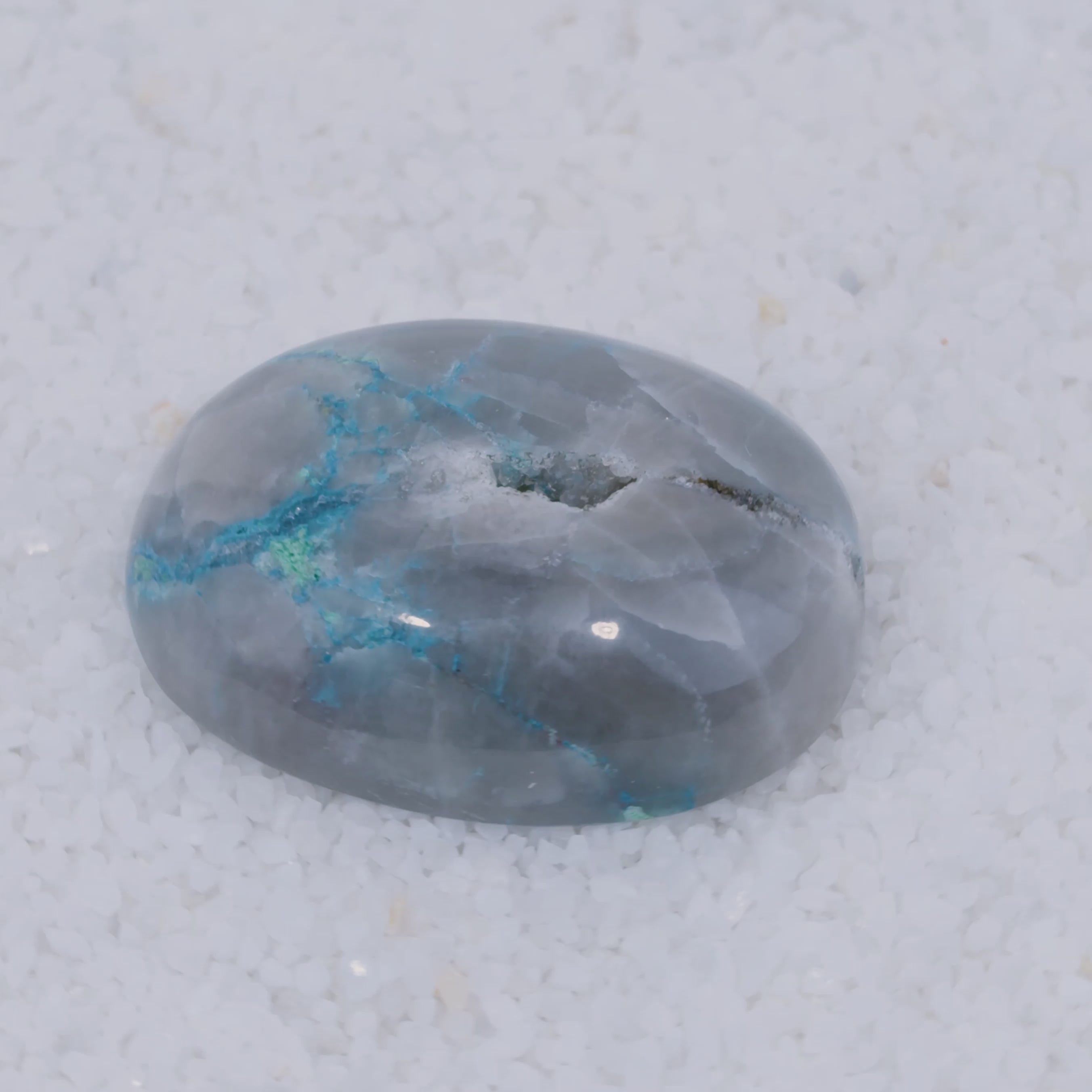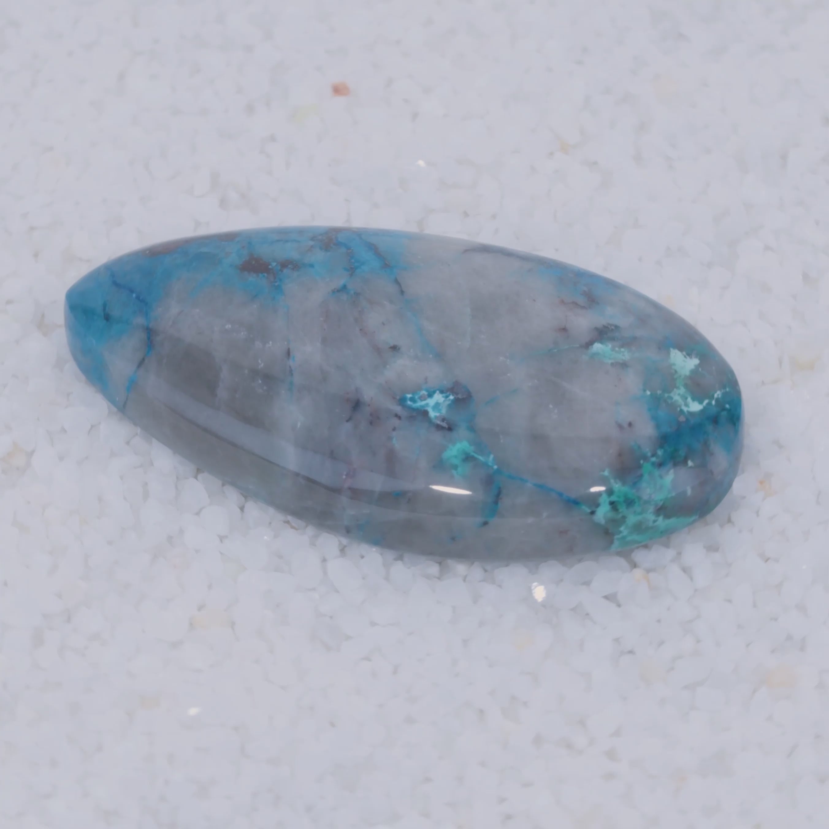 Pending Raman Analysis A glossy, oval-shaped gray stone with vivid blue copper silicate veins rests on white crystals. Its natural blue streaks contrast sharply with the gray—a rare cabochon from Canyonite Sky LTD.