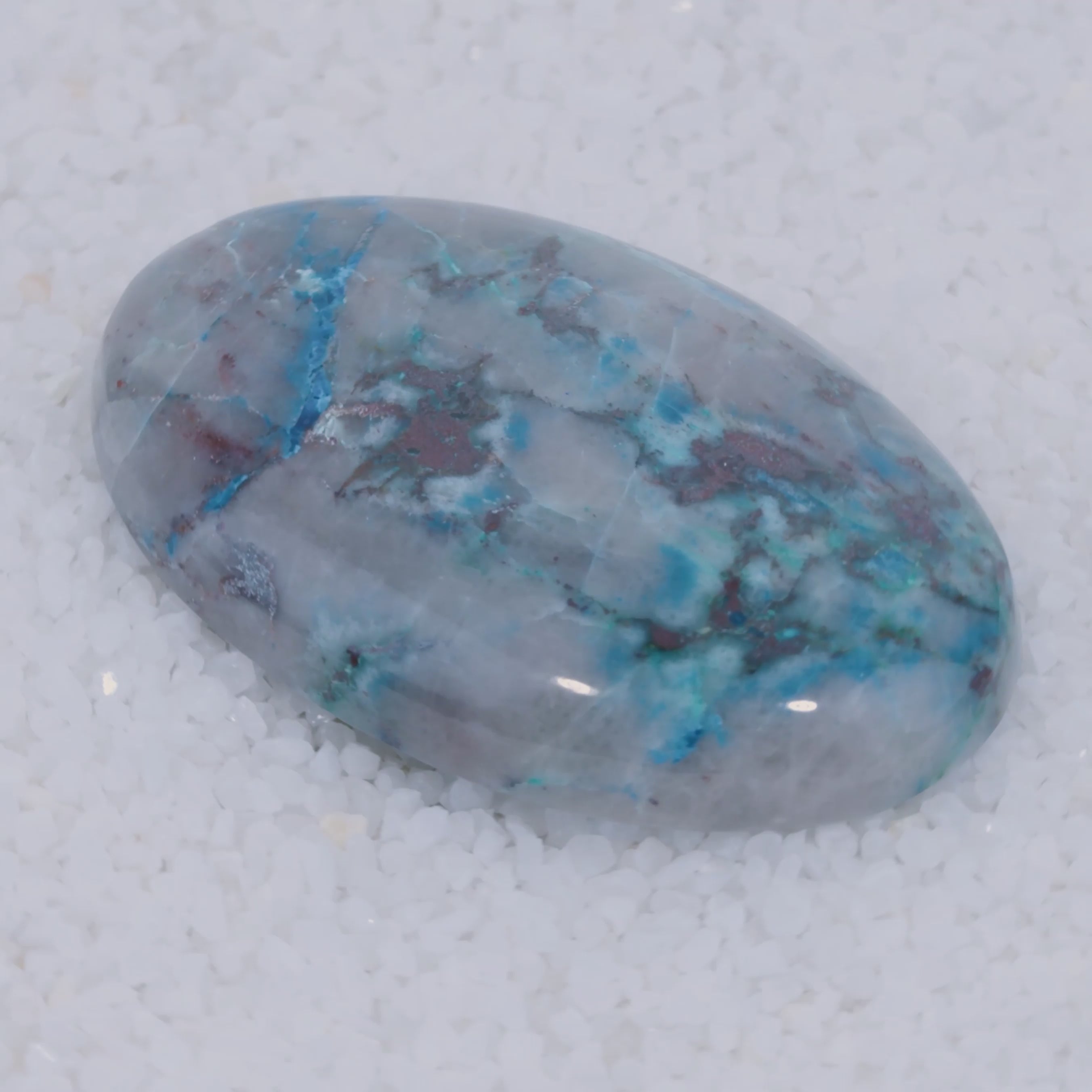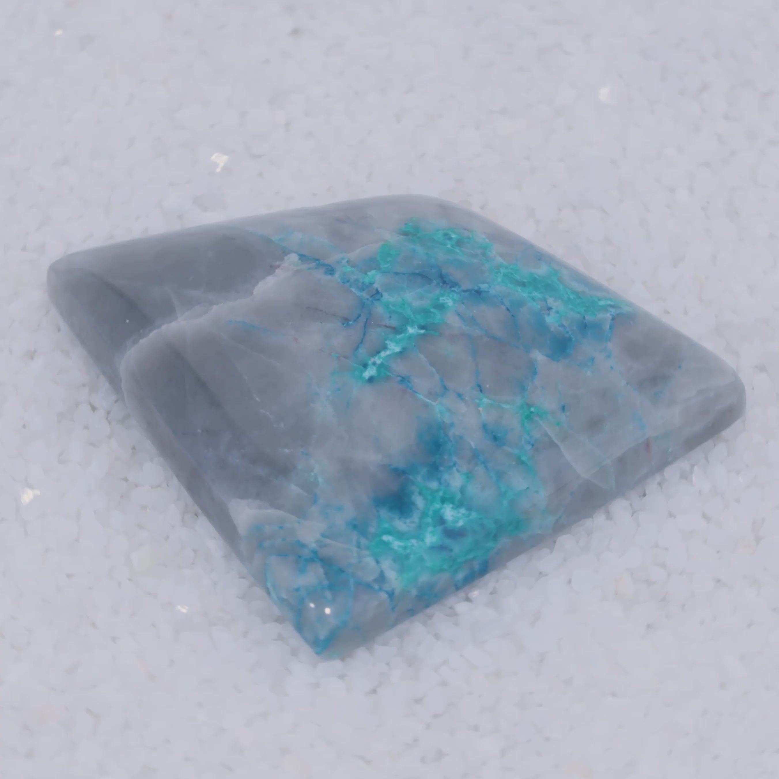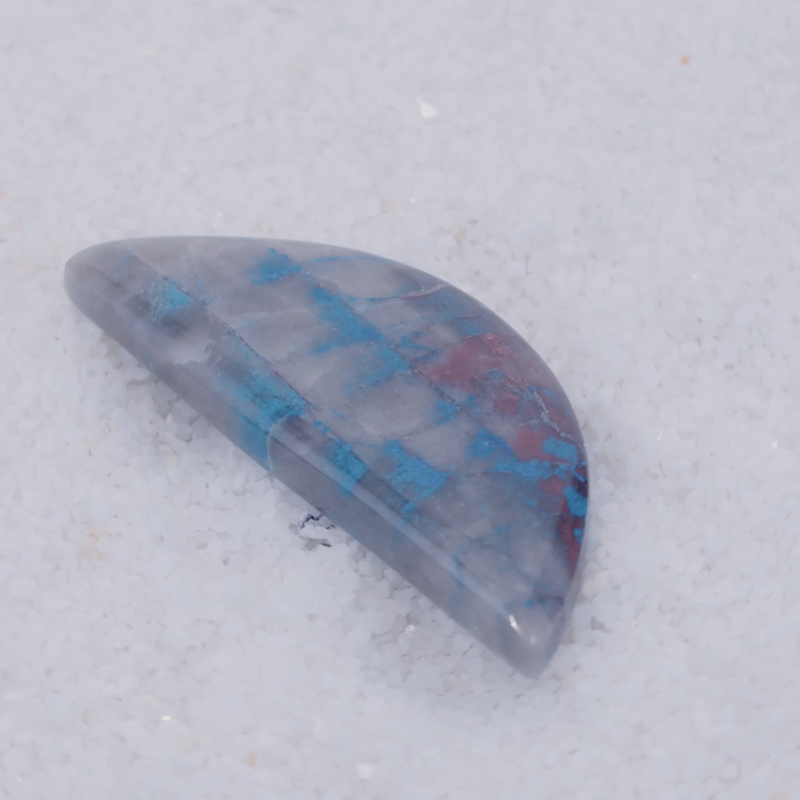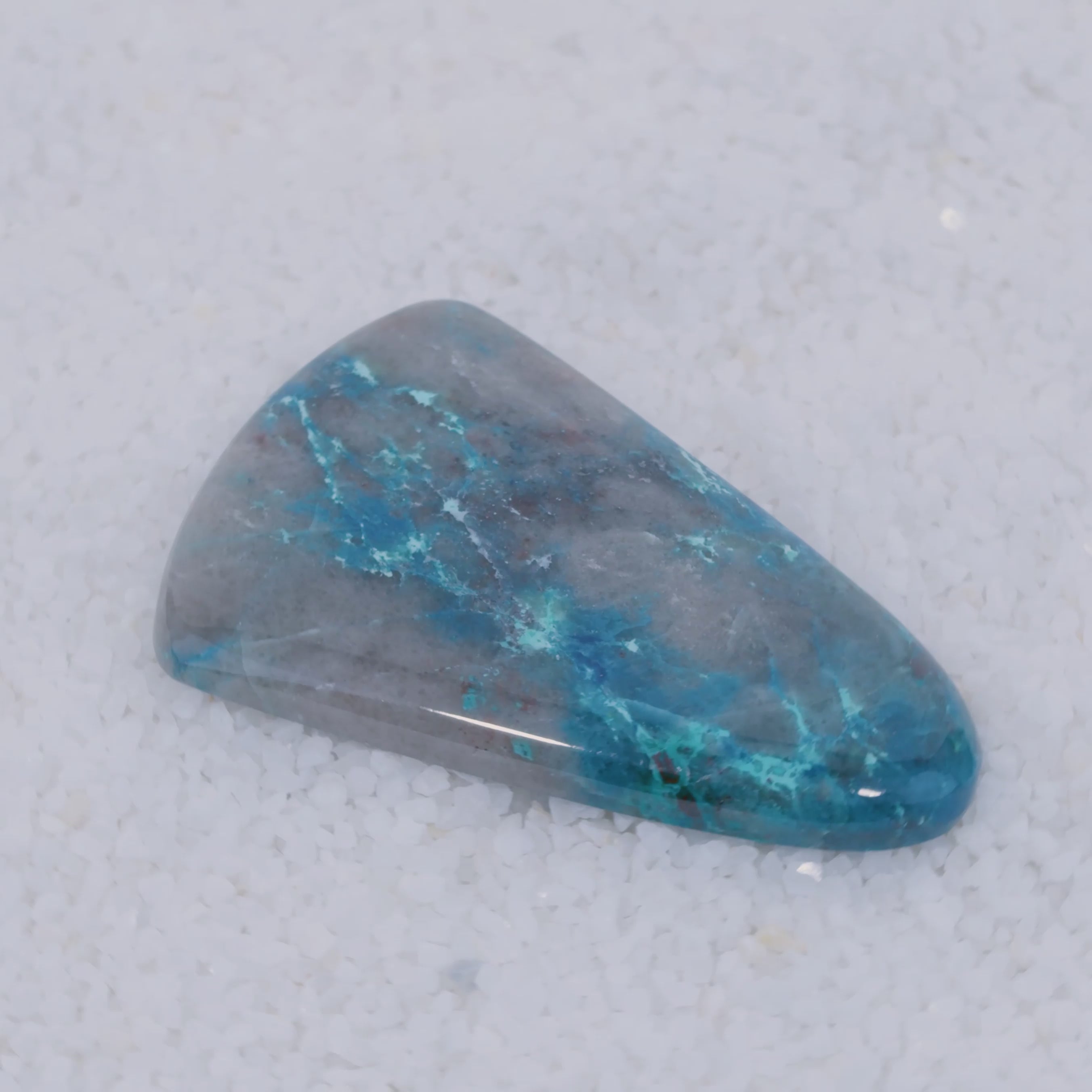 Pending Raman Analysis A glossy, oval-shaped gray stone with vivid blue copper silicate veins rests on white crystals. Its natural blue streaks contrast sharply with the gray—a rare cabochon from Canyonite Sky LTD.