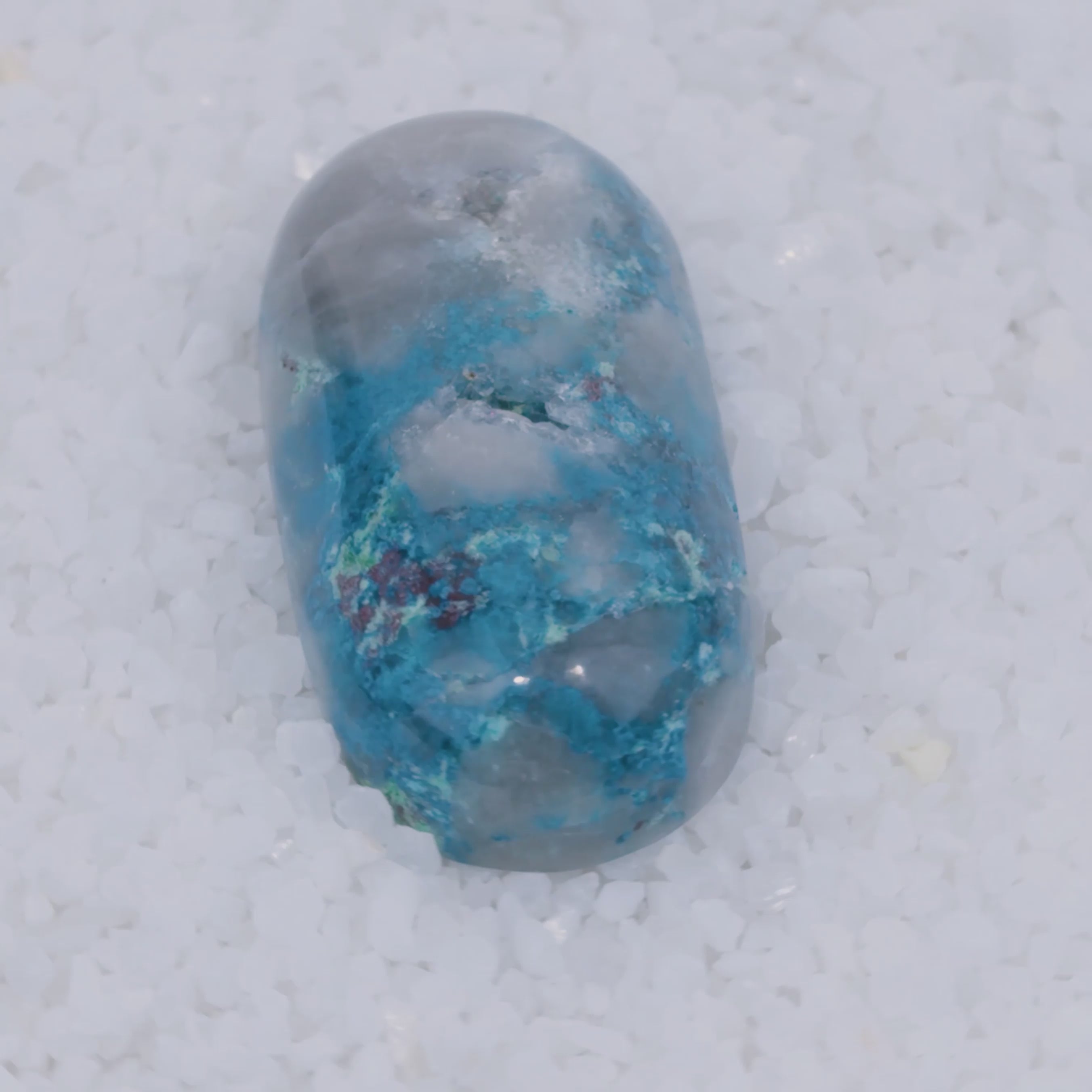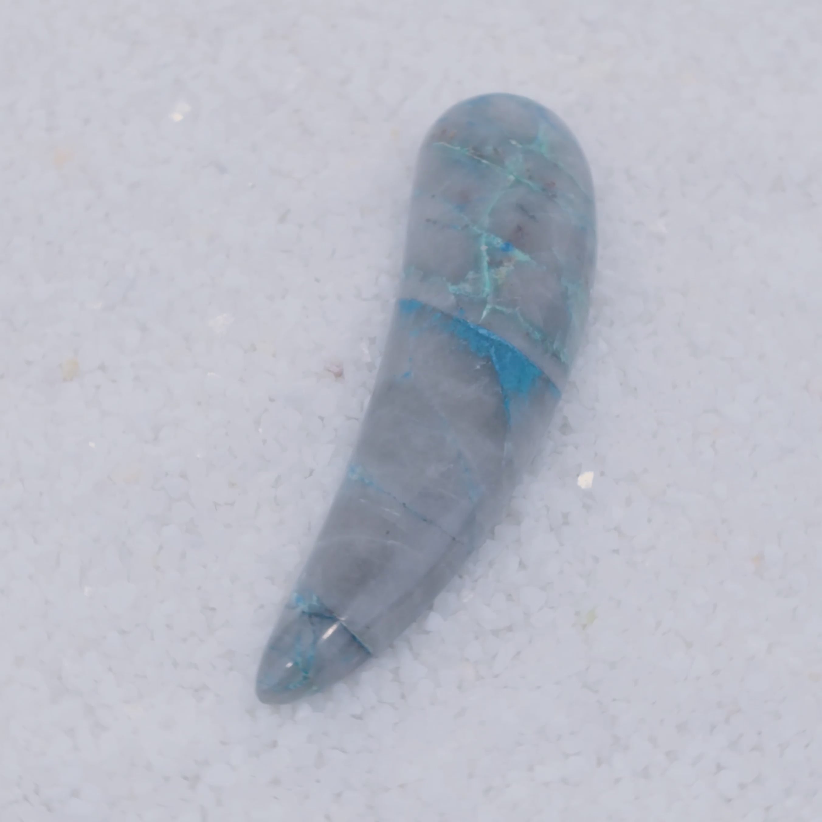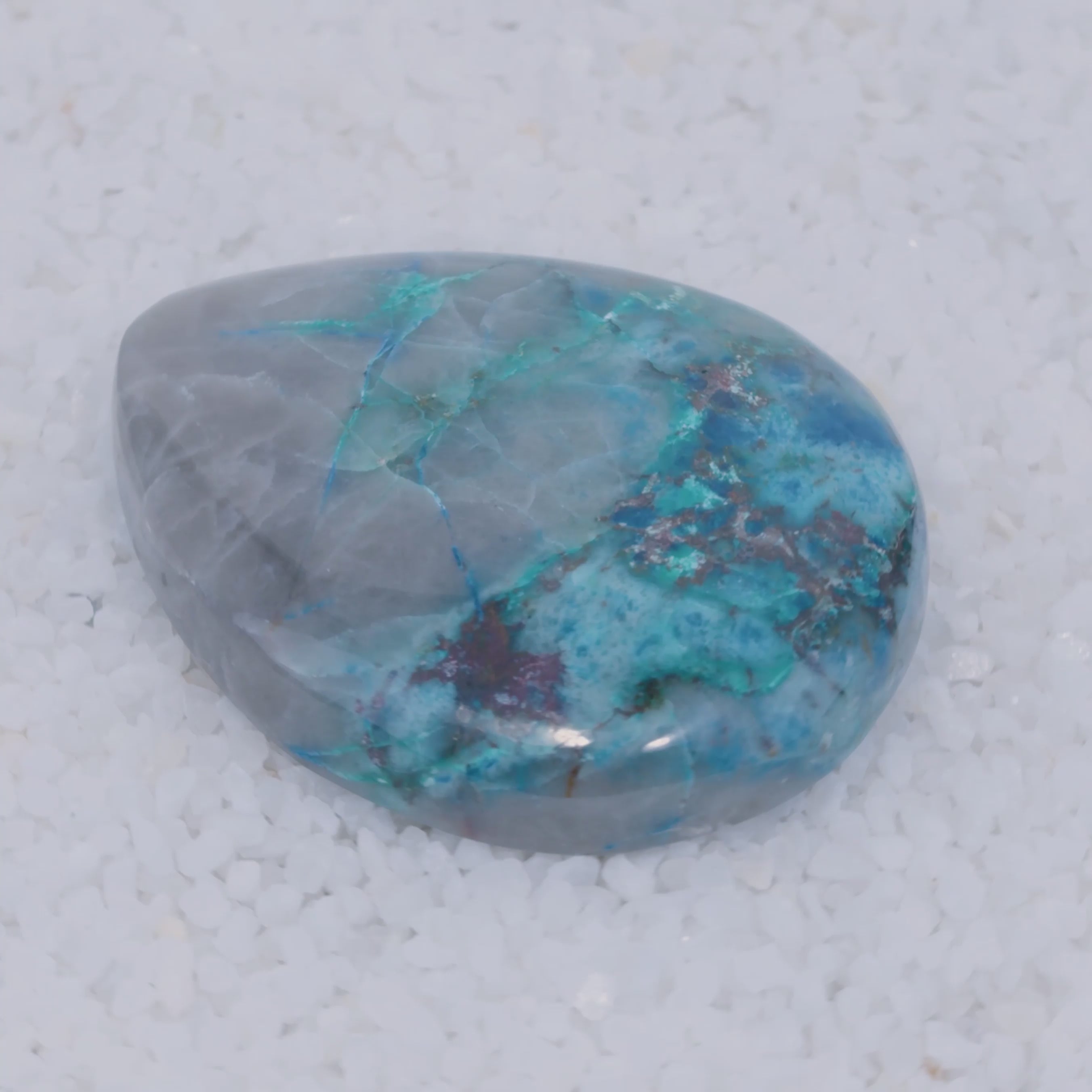 Pending Raman Analysis A smooth, polished teardrop-shaped Canyonite Sky LTD stone with a gradient from light gray to vibrant blue and rich in copper silicate minerals, resting on small white crystals—a striking gemstone for collectors.