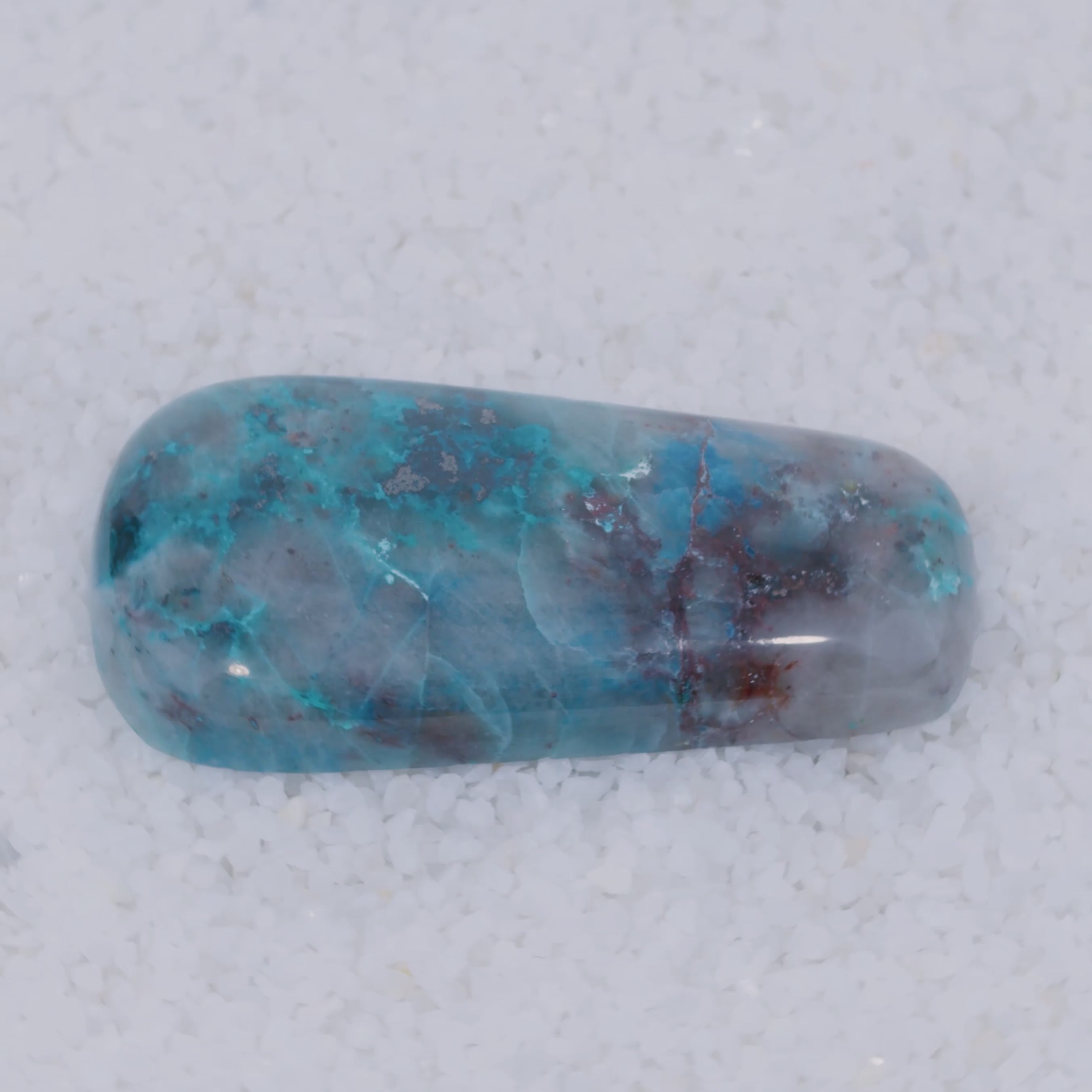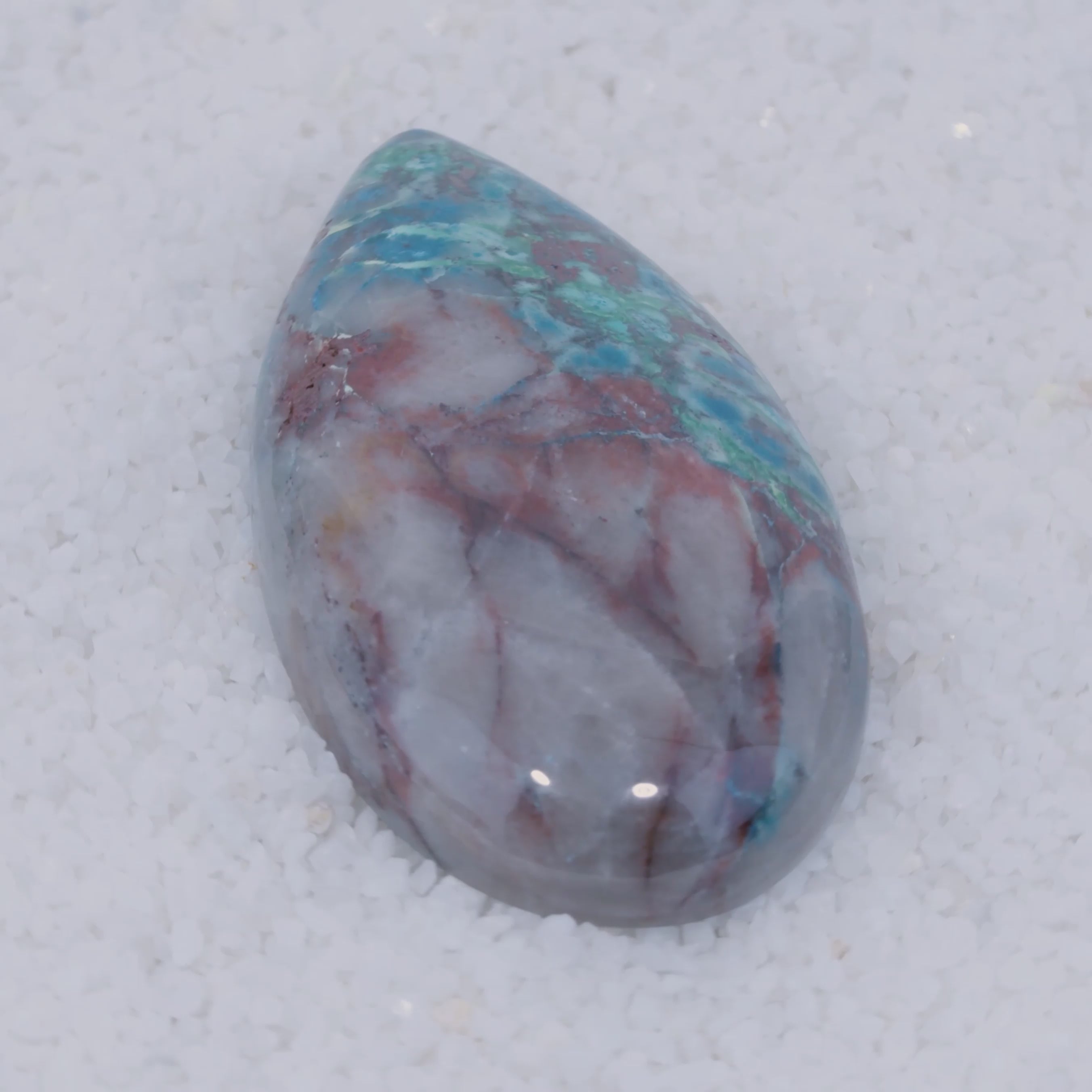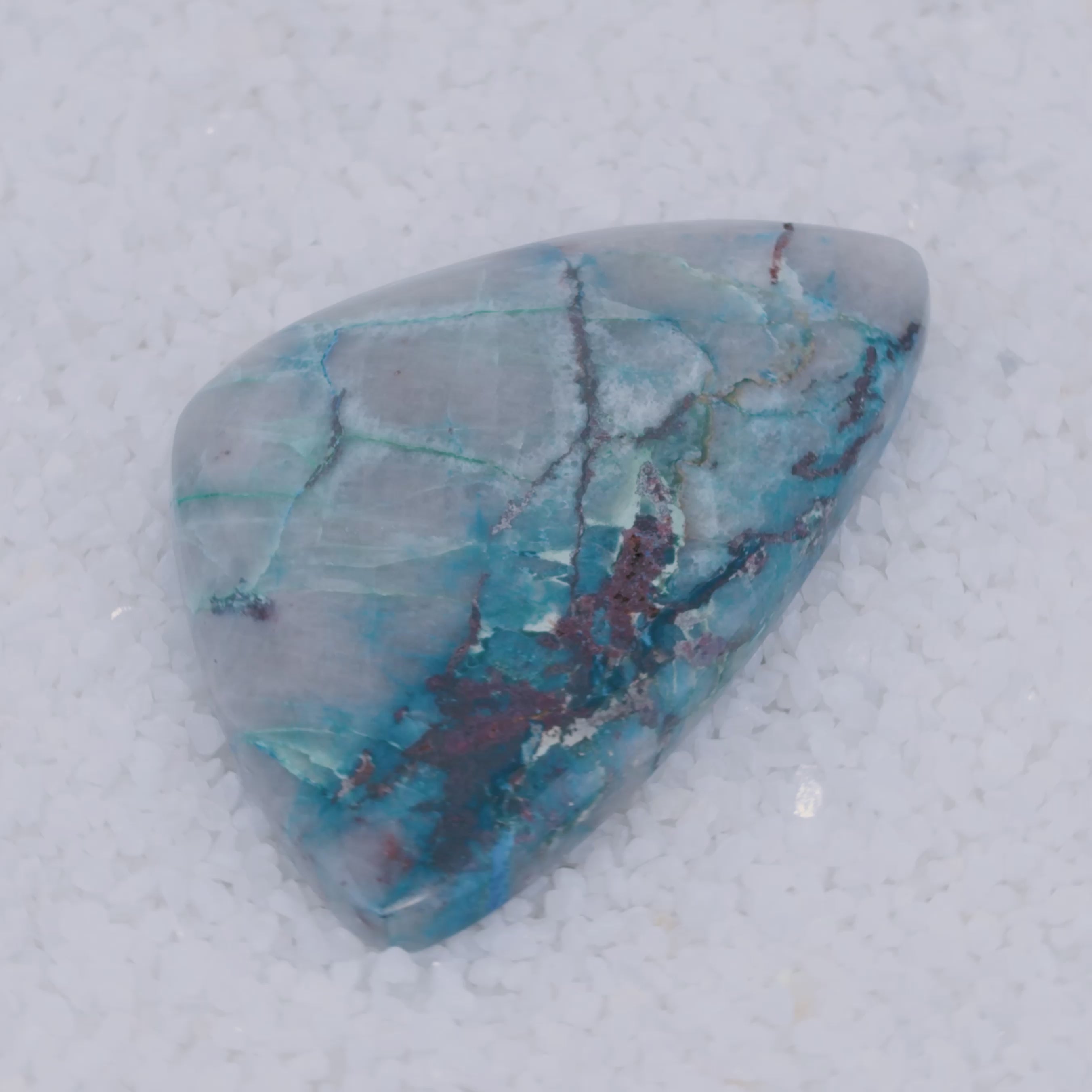 Pending Raman Analysis A smooth, polished teardrop-shaped Canyonite Sky LTD stone with a gradient from light gray to vibrant blue and rich in copper silicate minerals, resting on small white crystals—a striking gemstone for collectors.