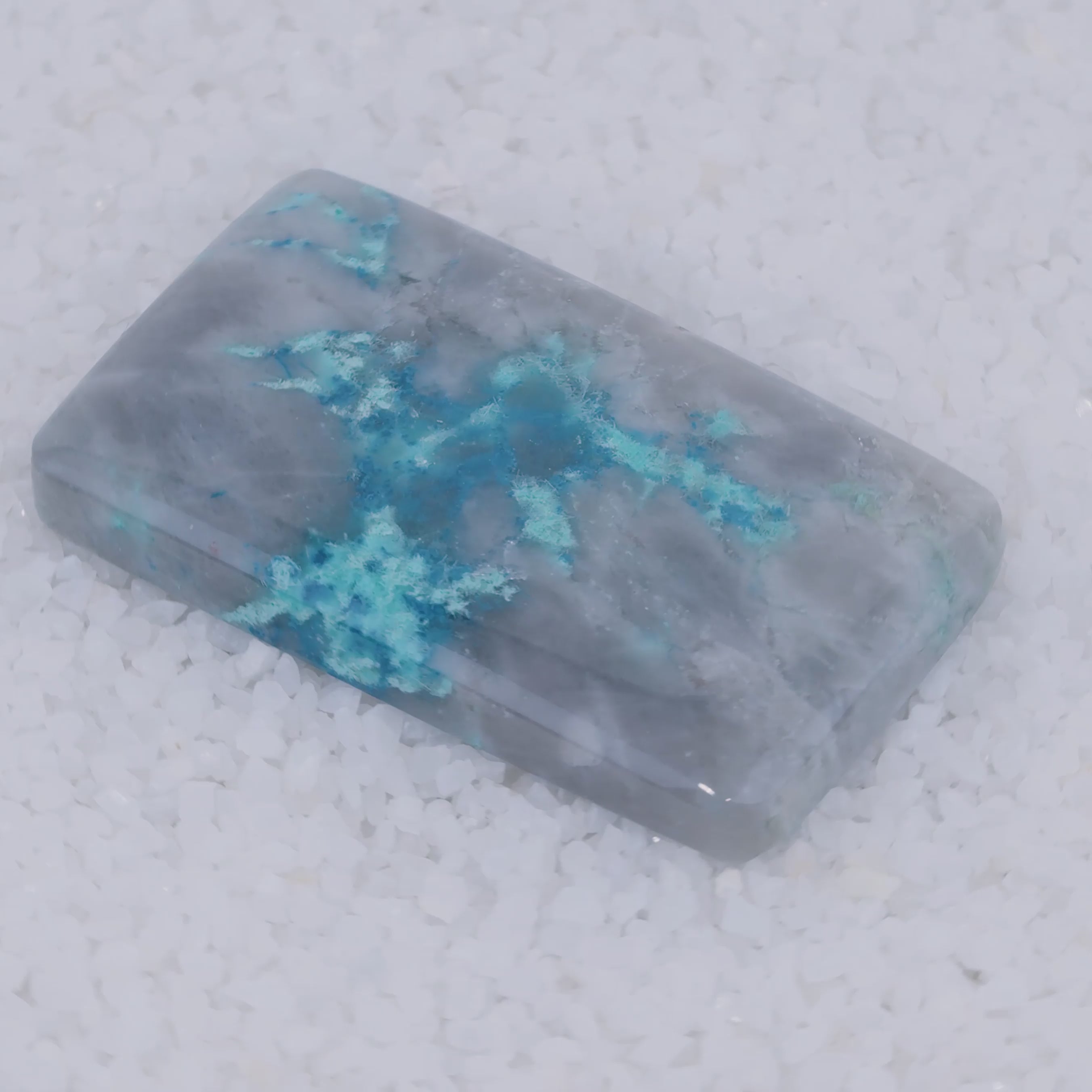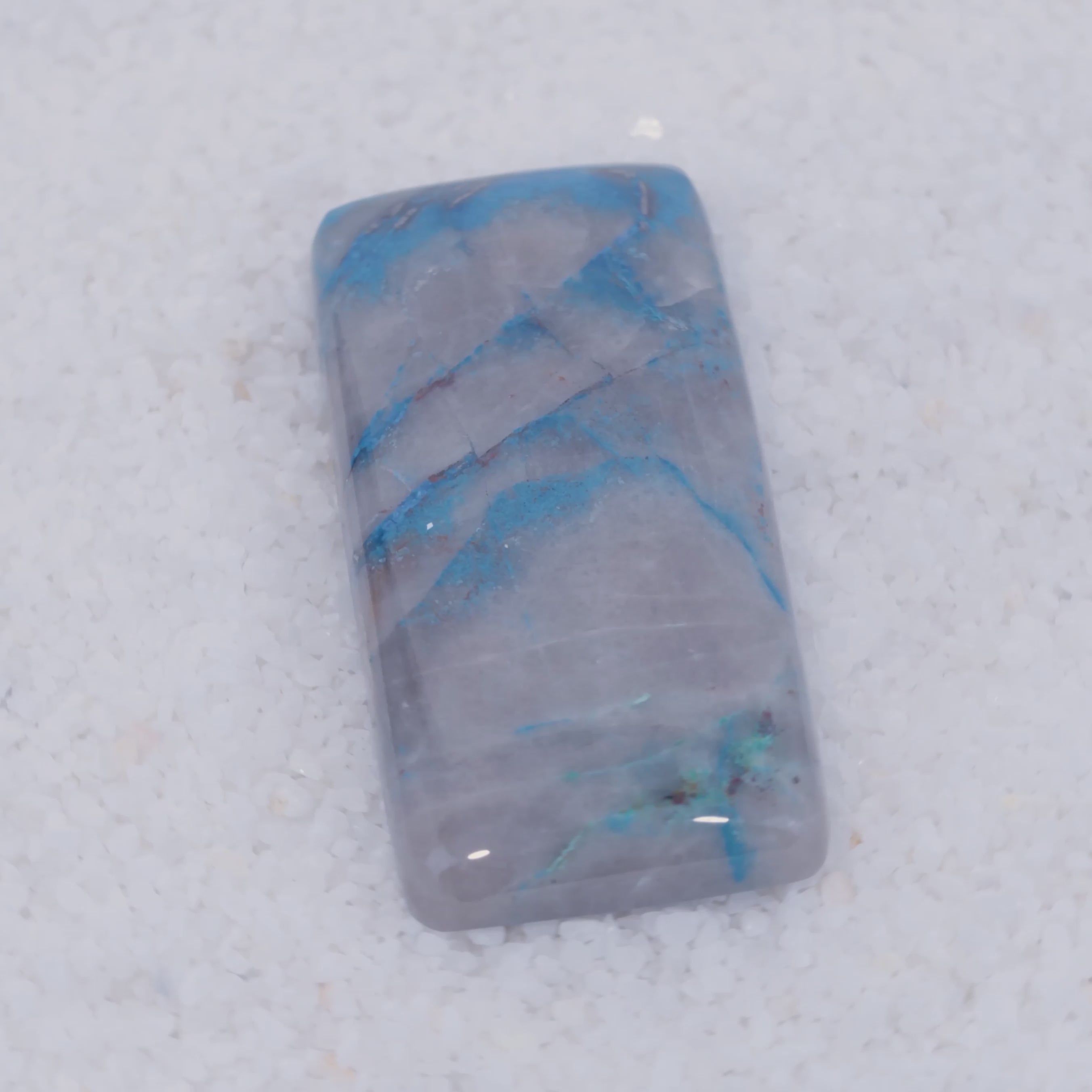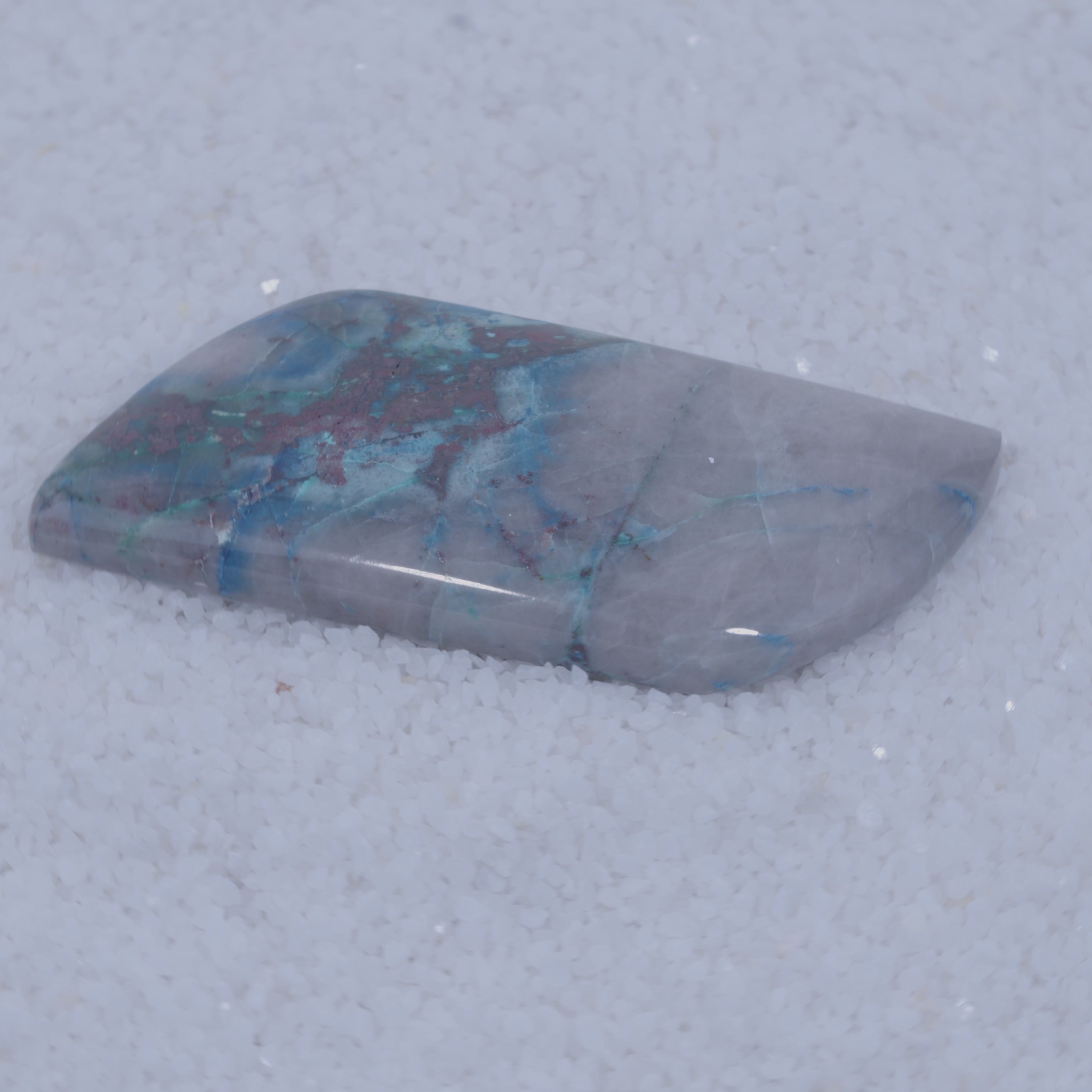 Pending Raman Analysis Polished stone with blue and gray patterns on a white background Canyonite rectangular cabochon