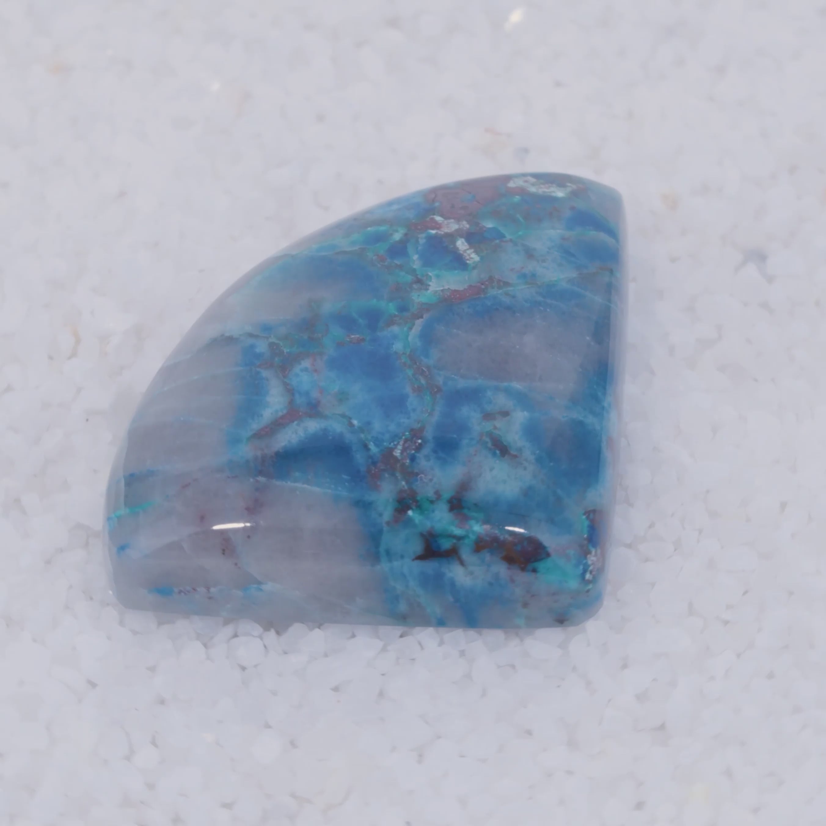 Pending Raman Analysis A polished, triangular Canyonite Sky LTD gemstone with a smooth surface features cloudy gray and vivid blue copper silicate patterns, creating a striking look against white pebbles. Irregular blue areas add to the gem’s unique appeal.