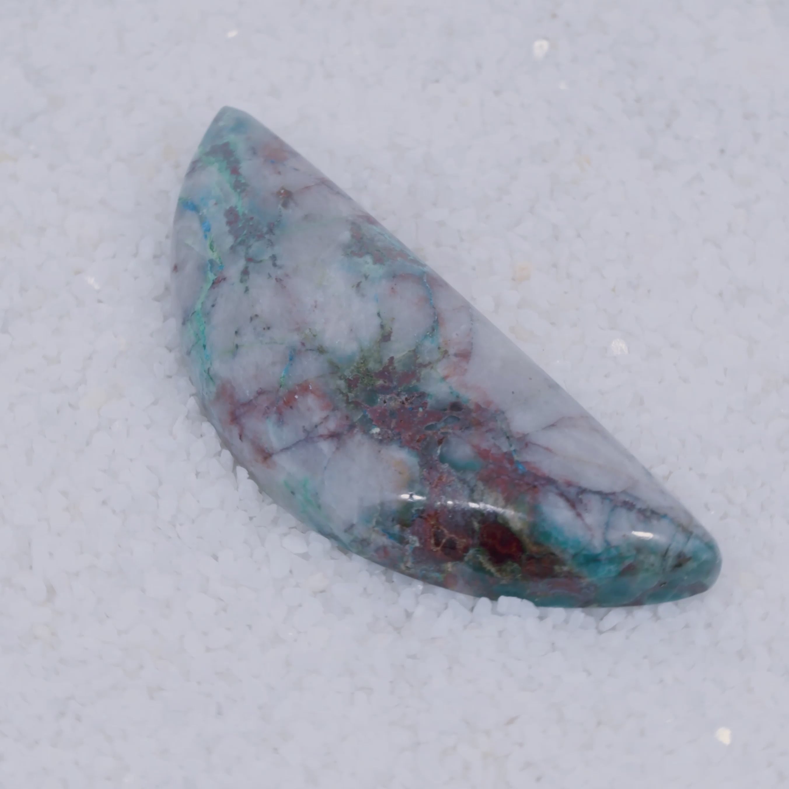 Pending Raman Analysis A polished triangular Canyonite Sky LTD cabochon displays blue, green, gray, and reddish-brown veining with varied patterns and natural inclusions on a smooth, glossy surface; a rare collector’s gemstone resting on white pebbles.