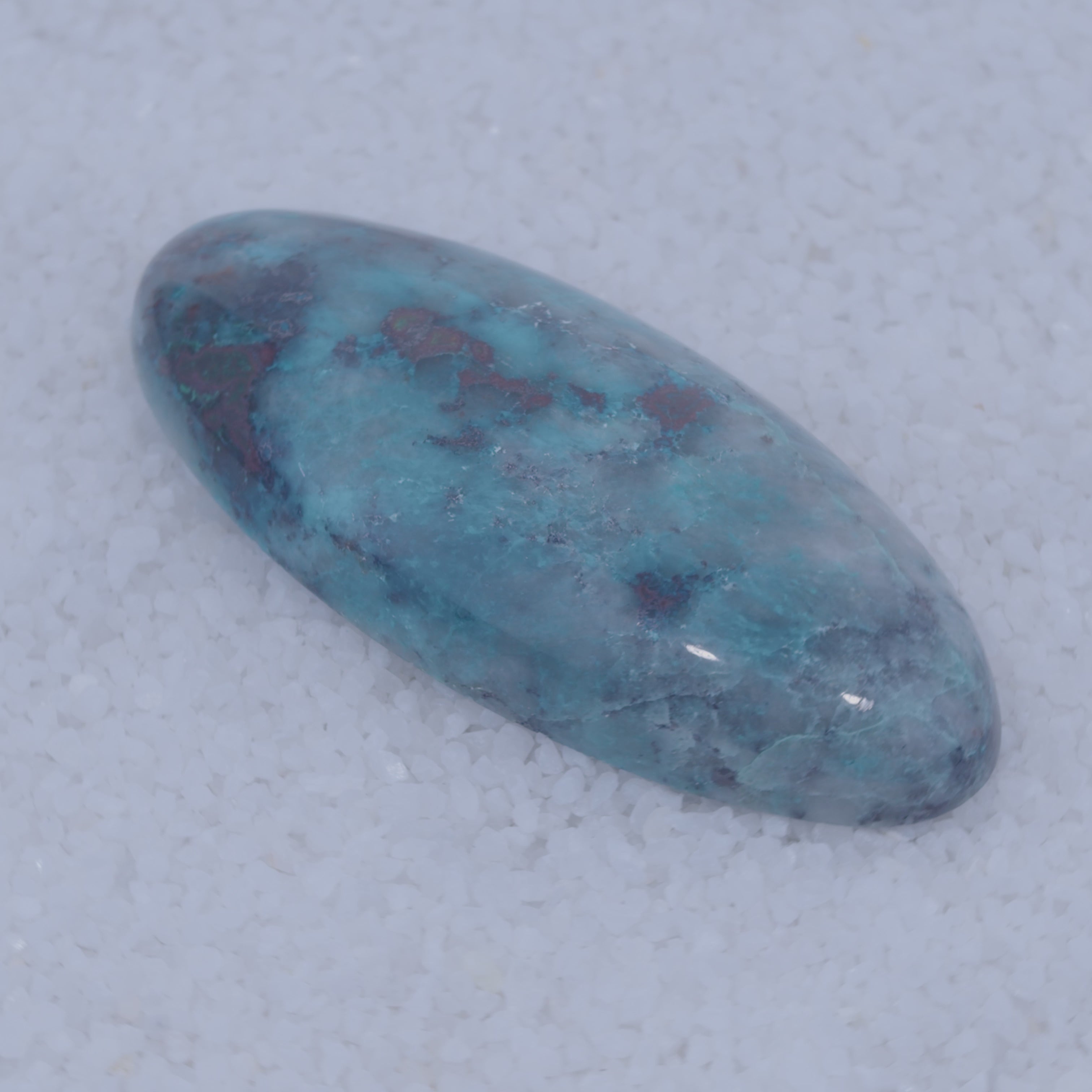 Pending Raman Analysis A polished Canyonite Sky cabochon by Canyonite Sky LTD features a gray base, bright blue streaks, and reddish-brown veins. Its smooth surface reflects light atop white pebbles, making it a stunning collector’s gemstone.