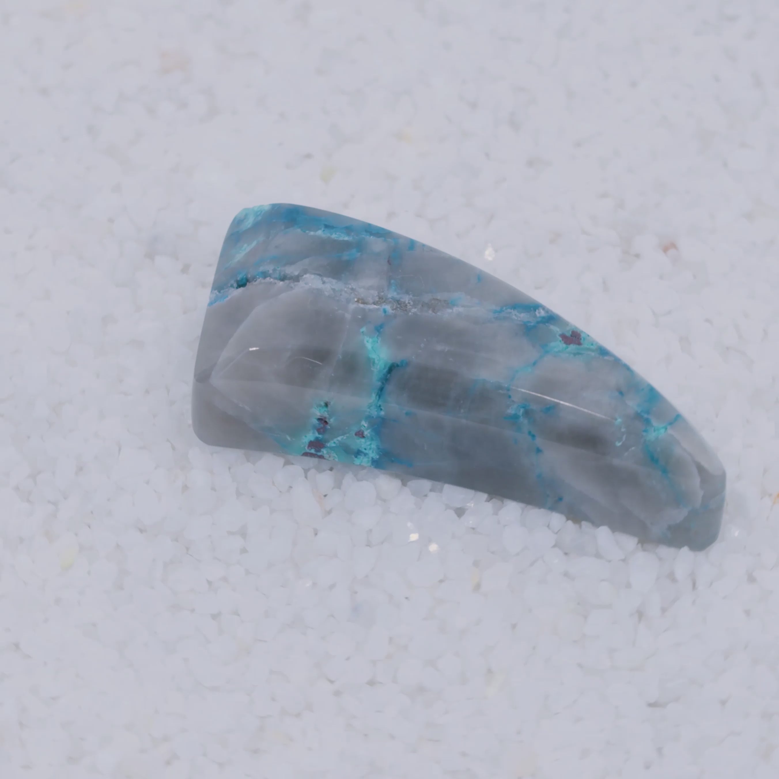 Pending Raman Analysis Triangular Canyonite stone with blue and red patterns on a white background