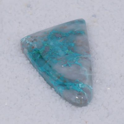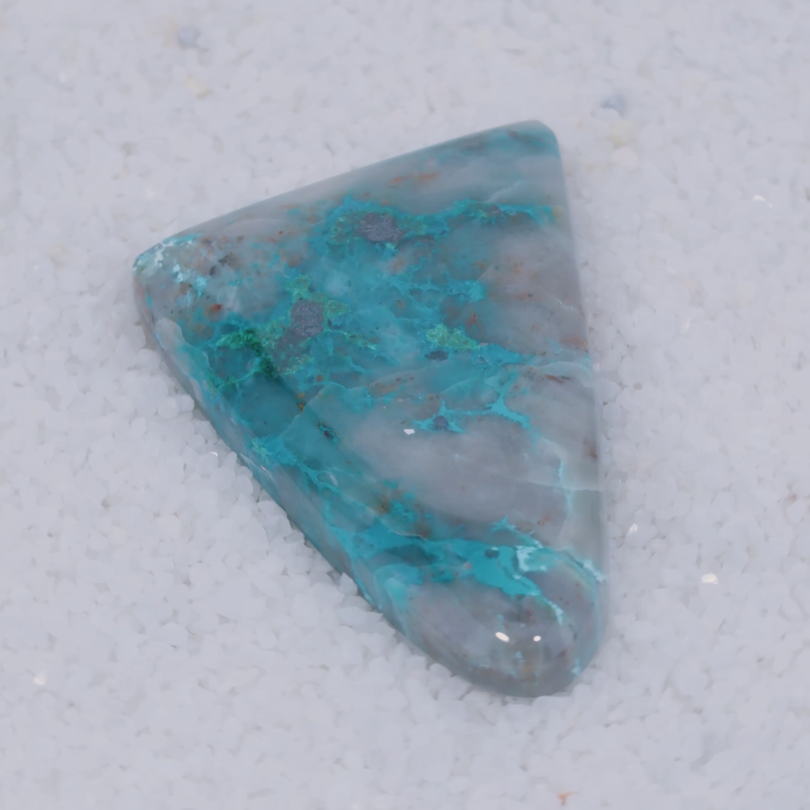 A once-in-a-lifetime rarity from Southern Arizona, this cabochon showcases vivid emerald-green Brochantite crystals, sky-blue Chrysocolla and crimson Cuprite suspended in translucent chalcedony. While Brochantite is sometimes found on quartz or other matrix, it is exceptionally rare included in matrix, especially chalcedony, making this gemstone a one of a kind discovery.