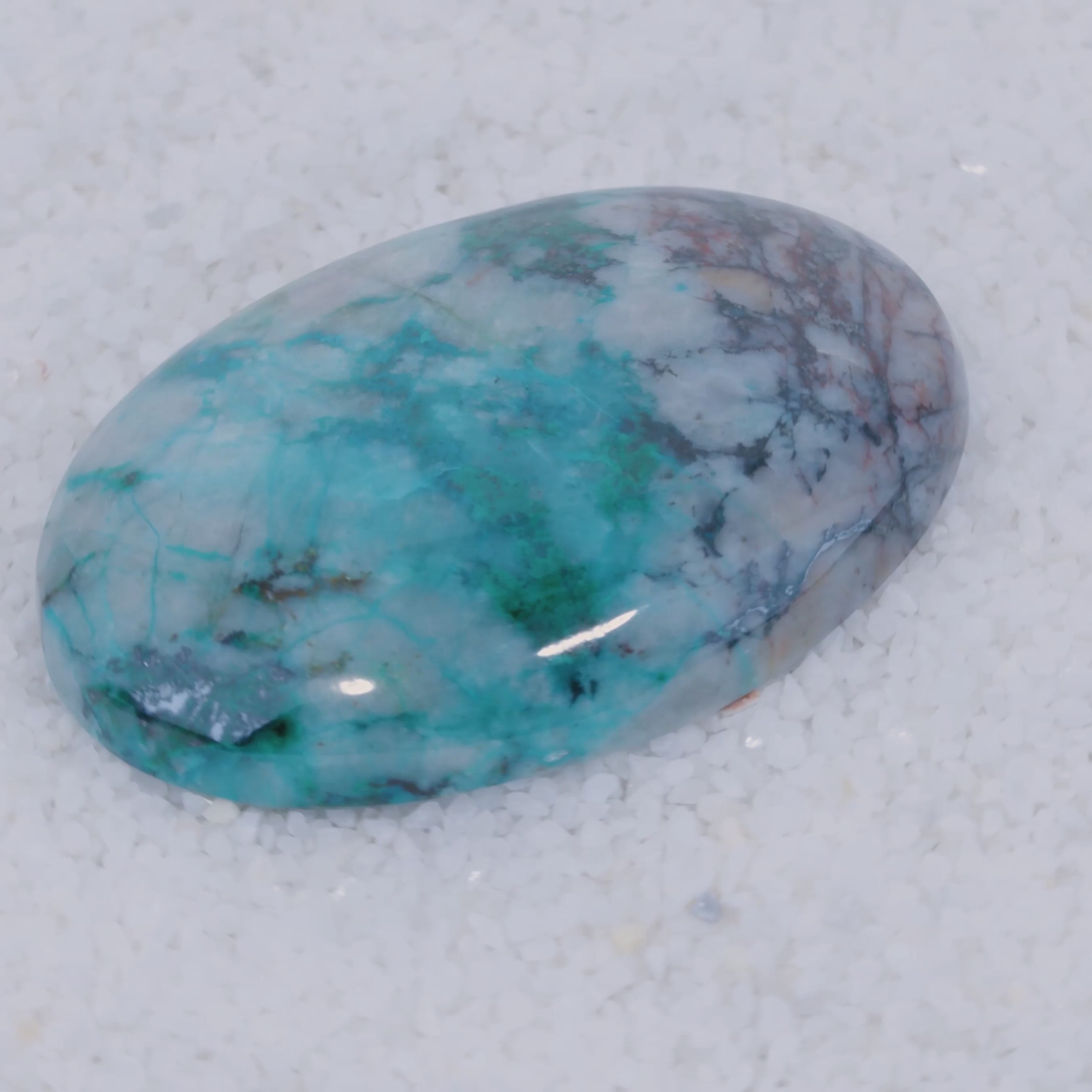 A once-in-a-lifetime rarity from Southern Arizona, this cabochon showcases vivid emerald-green Brochantite crystals, sky-blue Chrysocolla and crimson Cuprite suspended in translucent chalcedony. While Brochantite is sometimes found on quartz or other matrix, it is exceptionally rare included in matrix, especially chalcedony, making this gemstone a one of a kind discovery.