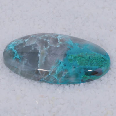 A once-in-a-lifetime rarity from Southern Arizona, this cabochon showcases vivid emerald-green Brochantite crystals, sky-blue Chrysocolla and crimson Cuprite suspended in translucent chalcedony. While Brochantite is sometimes found on quartz or other matrix, it is exceptionally rare included in matrix, especially chalcedony, making this gemstone a one of a kind discovery.