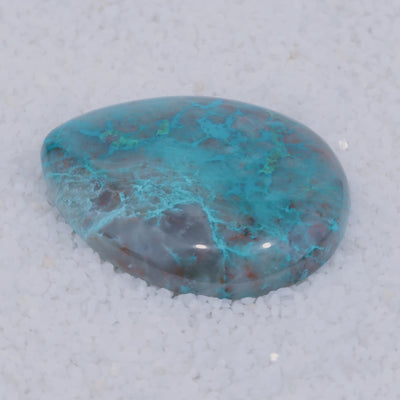 A once-in-a-lifetime rarity from Southern Arizona, this cabochon showcases vivid emerald-green Brochantite crystals, sky-blue Chrysocolla and crimson Cuprite suspended in translucent chalcedony. While Brochantite is sometimes found on quartz or other matrix, it is exceptionally rare included in matrix, especially chalcedony, making this gemstone a one of a kind discovery.