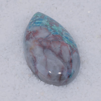 Sourced from a small singular deposit in Southern Arizona, Canyonite Sky is a copper mineral gemstone of unmatched rarity. This cabochon reveals sky-blue Papagoite, teal Ajoite, indigo Shattuckite—three of the world's rarest copper minerals—embedded with crimson Cuprite in a translucent druzy chalcedony matrix.