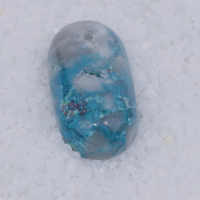 Sourced from a small singular deposit in Southern Arizona, Canyonite Sky is a copper mineral gemstone of unmatched rarity. This cabochon reveals sky-blue Papagoite, teal Ajoite, indigo Shattuckite—three of the world's rarest copper minerals—embedded with crimson Cuprite in a translucent druzy chalcedony matrix.