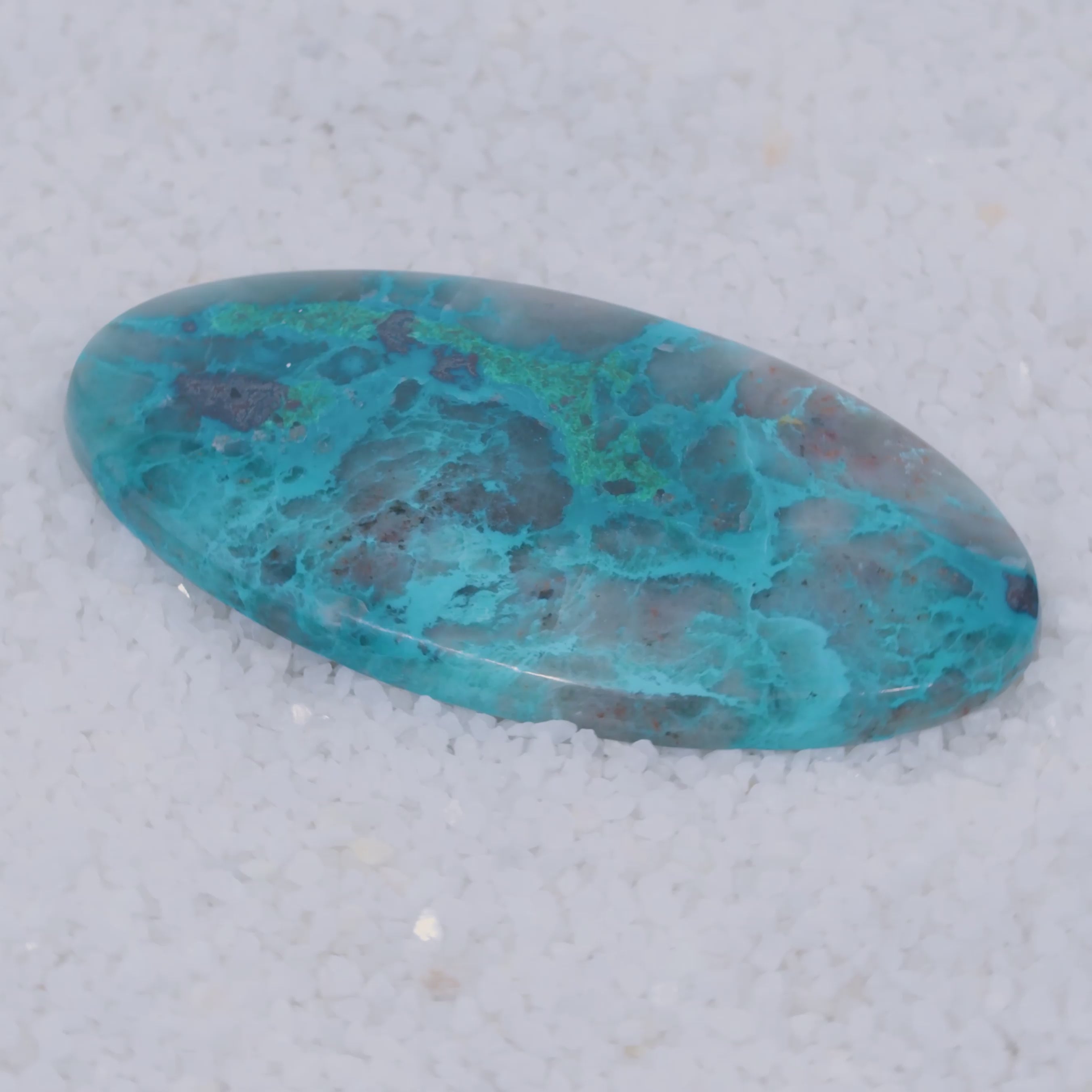 A once-in-a-lifetime rarity from Southern Arizona, this cabochon showcases vivid emerald-green Brochantite crystals, sky-blue Chrysocolla and crimson Cuprite suspended in translucent chalcedony. While Brochantite is sometimes found on quartz or other matrix, it is exceptionally rare included in matrix, especially chalcedony, making this gemstone a one of a kind discovery.
