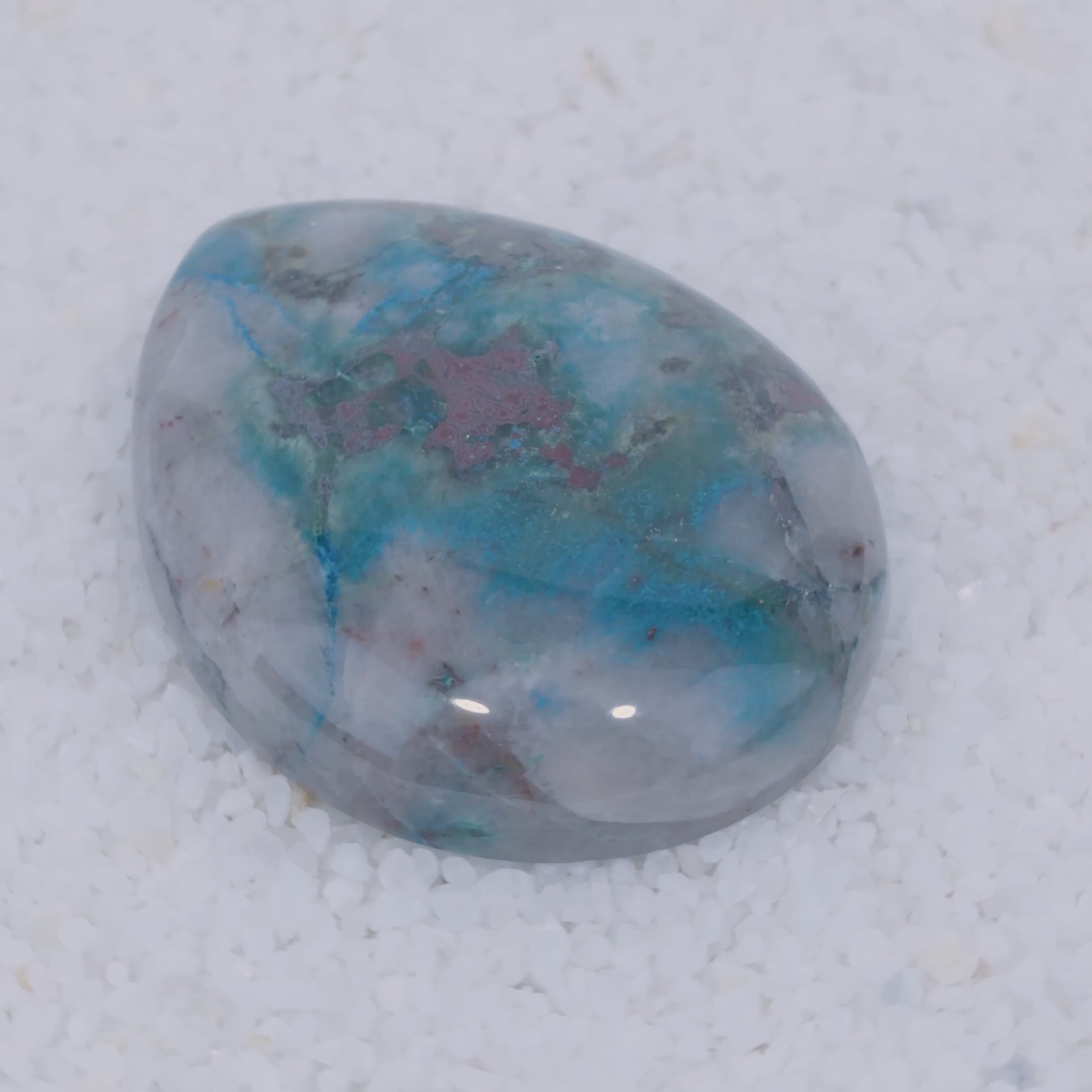 Sourced from a small singular deposit in Southern Arizona, Canyonite Sky is a copper mineral gemstone of unmatched rarity. This cabochon reveals sky-blue Papagoite, teal Ajoite, indigo Shattuckite—three of the world's rarest copper minerals—embedded with crimson Cuprite in a translucent druzy chalcedony matrix.