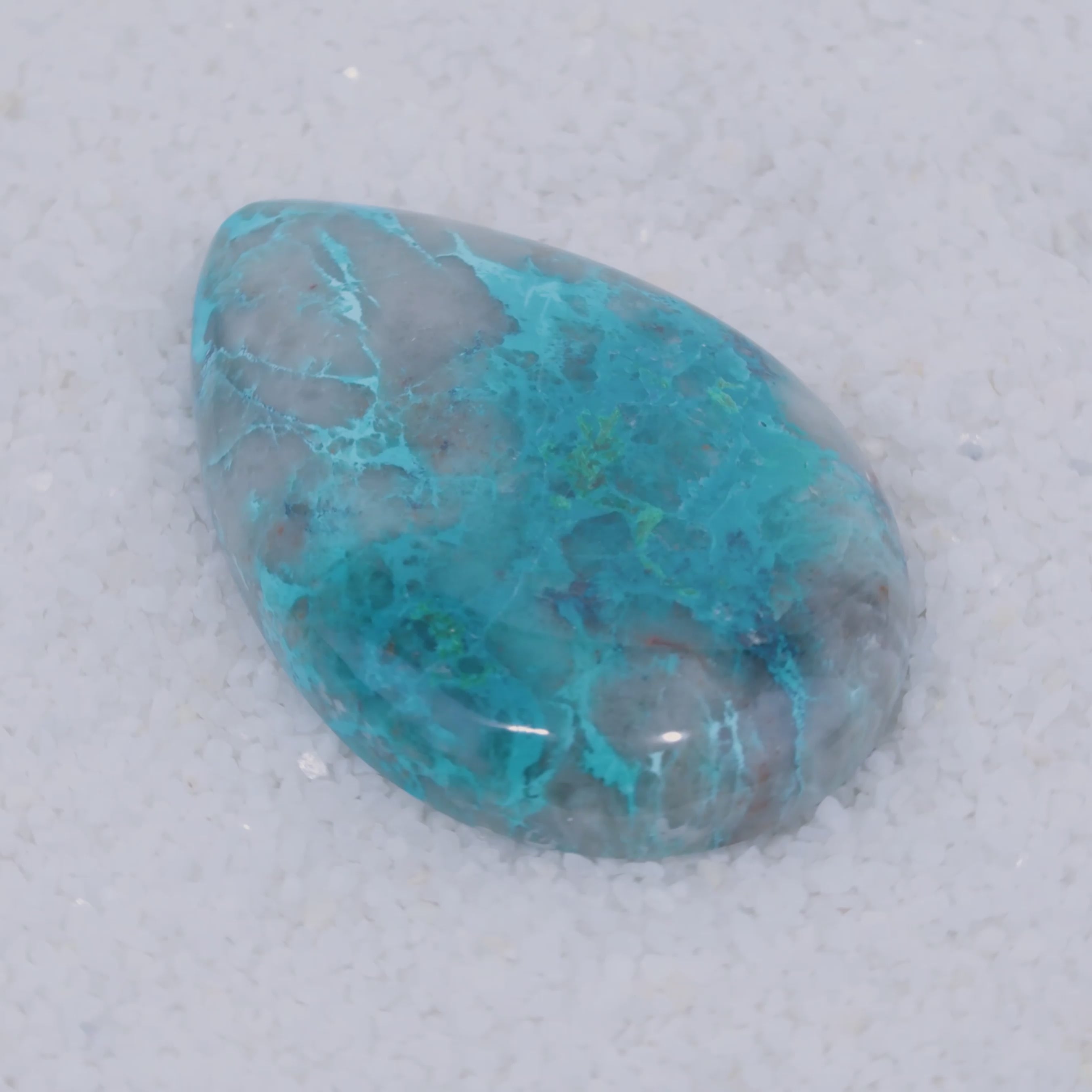 Sourced from a small singular deposit in Southern Arizona, Canyonite Sky is a copper mineral gemstone of unmatched rarity. This cabochon reveals sky-blue Papagoite, teal Ajoite, indigo Shattuckite—three of the world's rarest copper minerals—embedded with crimson Cuprite in a translucent druzy chalcedony matrix.