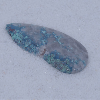 Sourced from a small singular deposit in Southern Arizona, Canyonite Sky is a copper mineral gemstone of unmatched rarity. This cabochon reveals sky-blue Papagoite, teal Ajoite, indigo Shattuckite—three of the world's rarest copper minerals—embedded with crimson Cuprite in a translucent druzy chalcedony matrix.