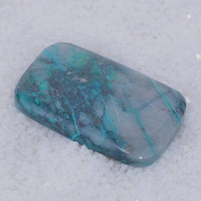 A once-in-a-lifetime rarity from Southern Arizona, this cabochon showcases vivid emerald-green Brochantite crystals, sky-blue Chrysocolla and crimson Cuprite suspended in translucent chalcedony. While Brochantite is sometimes found on quartz or other matrix, it is exceptionally rare included in matrix, especially chalcedony, making this gemstone a one of a kind discovery.