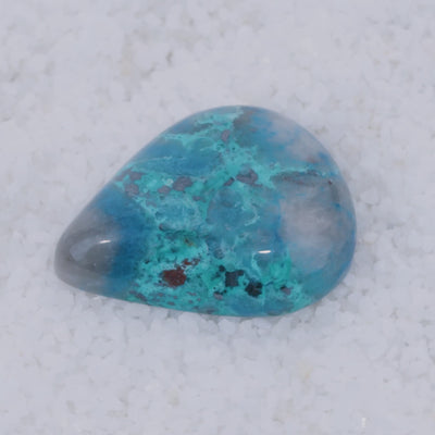Sourced from a small singular deposit in Southern Arizona, Canyonite Sky is a copper mineral gemstone of unmatched rarity. This cabochon reveals sky-blue Papagoite, teal Ajoite, indigo Shattuckite—three of the world's rarest copper minerals—embedded with crimson Cuprite in a translucent druzy chalcedony matrix.