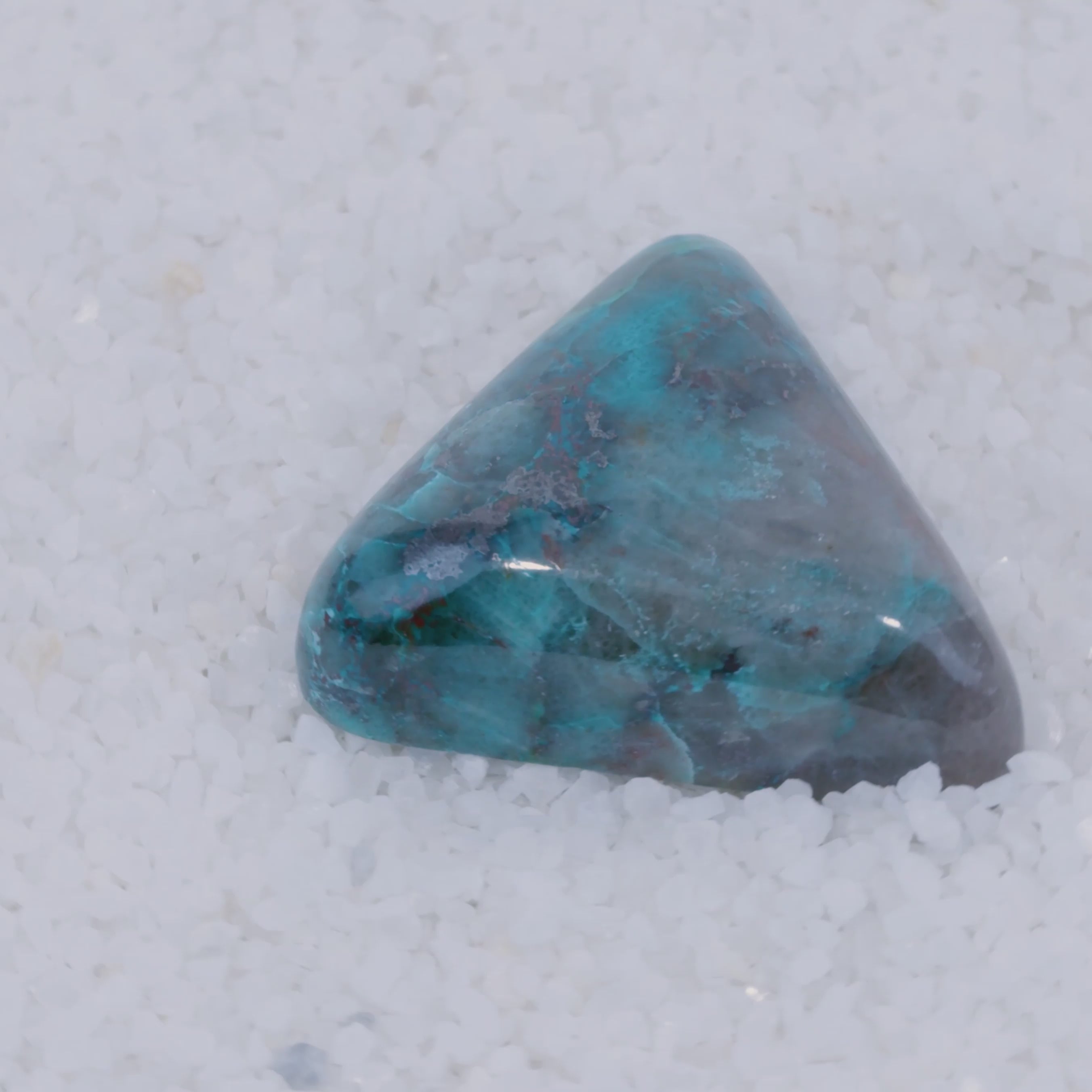 A once-in-a-lifetime rarity from Southern Arizona, this cabochon showcases vivid emerald-green Brochantite crystals, sky-blue Chrysocolla and crimson Cuprite suspended in translucent chalcedony. While Brochantite is sometimes found on quartz or other matrix, it is exceptionally rare included in matrix, especially chalcedony, making this gemstone a one of a kind discovery.