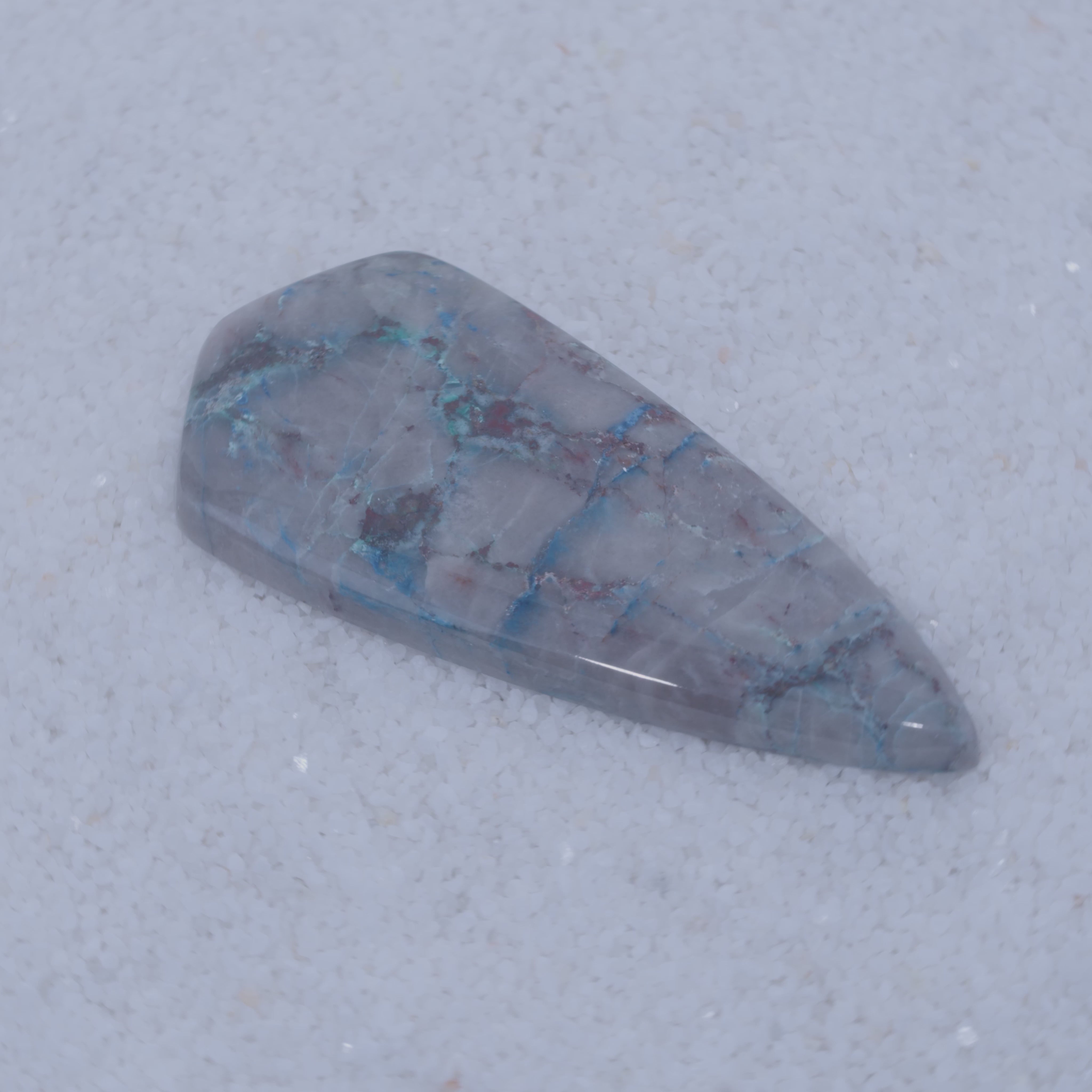 Sourced from a small singular deposit in Southern Arizona, Canyonite Sky is a copper mineral gemstone of unmatched rarity. This cabochon reveals sky-blue Papagoite, teal Ajoite, indigo Shattuckite—three of the world's rarest copper minerals—embedded with crimson Cuprite in a translucent druzy chalcedony matrix.