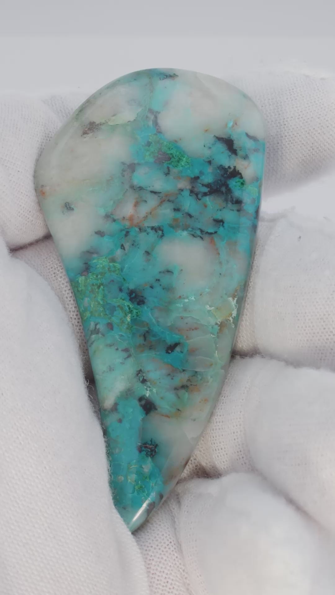 A once-in-a-lifetime rarity from Southern Arizona, this gemstone showcases vibrant emerald-green crystal Brochantite, sky-blue Chrysocolla, and crimson Cuprite, suspended in translucent chalcedony. Brochantite commonly forms as surface crystals. It is a rare occurrence to find Brochantite crystals inside a chalcedony matrix, making this gemstone a one of a kind rarity.