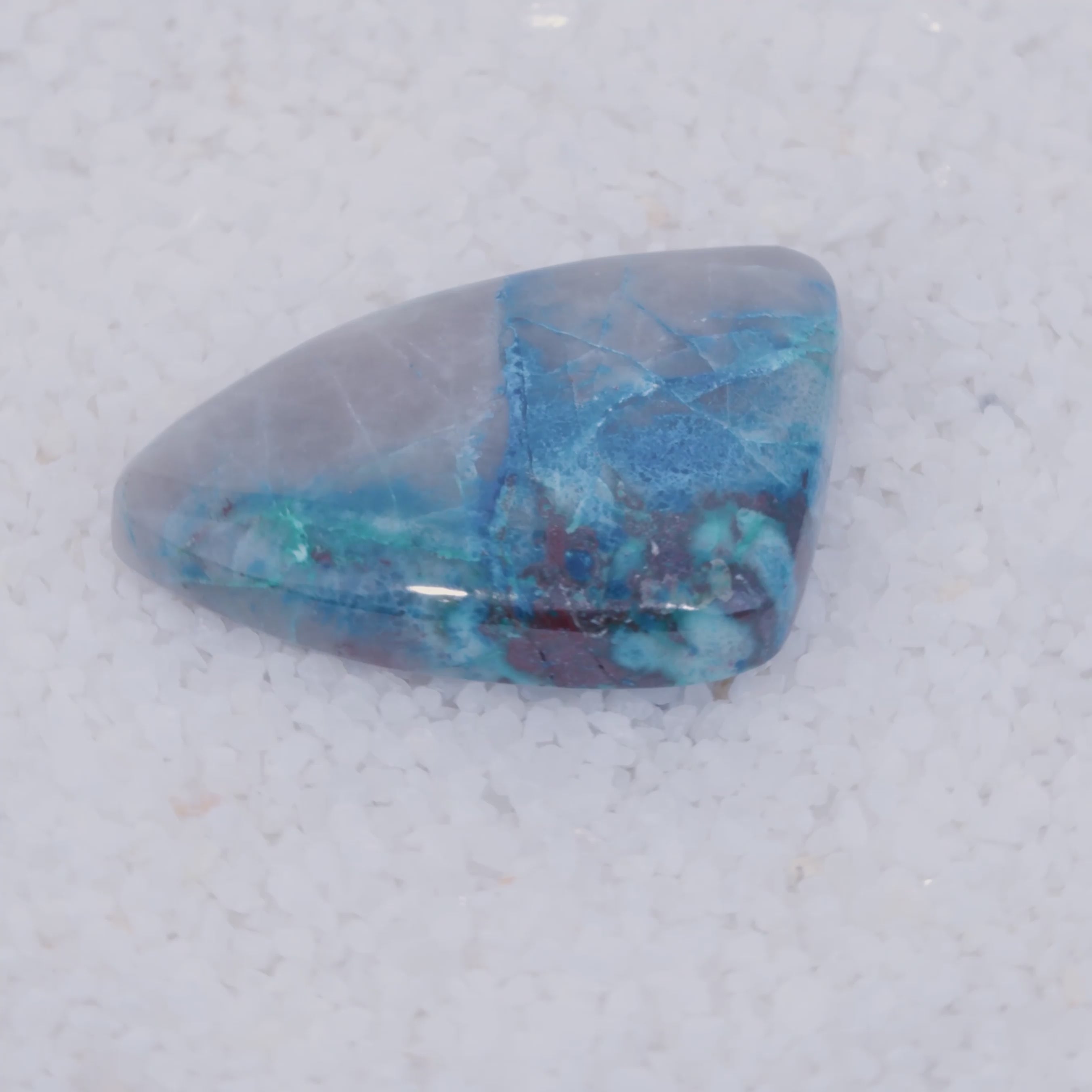 A once-in-a-lifetime rarity from Southern Arizona, this cabochon showcases vivid emerald-green Brochantite crystals, sky-blue Chrysocolla and crimson Cuprite suspended in translucent chalcedony. While Brochantite is sometimes found on quartz or other matrix, it is exceptionally rare included in matrix, especially chalcedony, making this gemstone a one of a kind discovery.