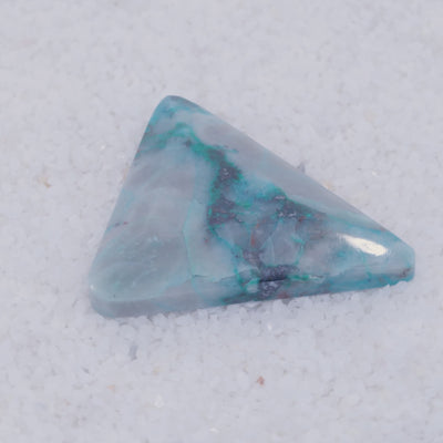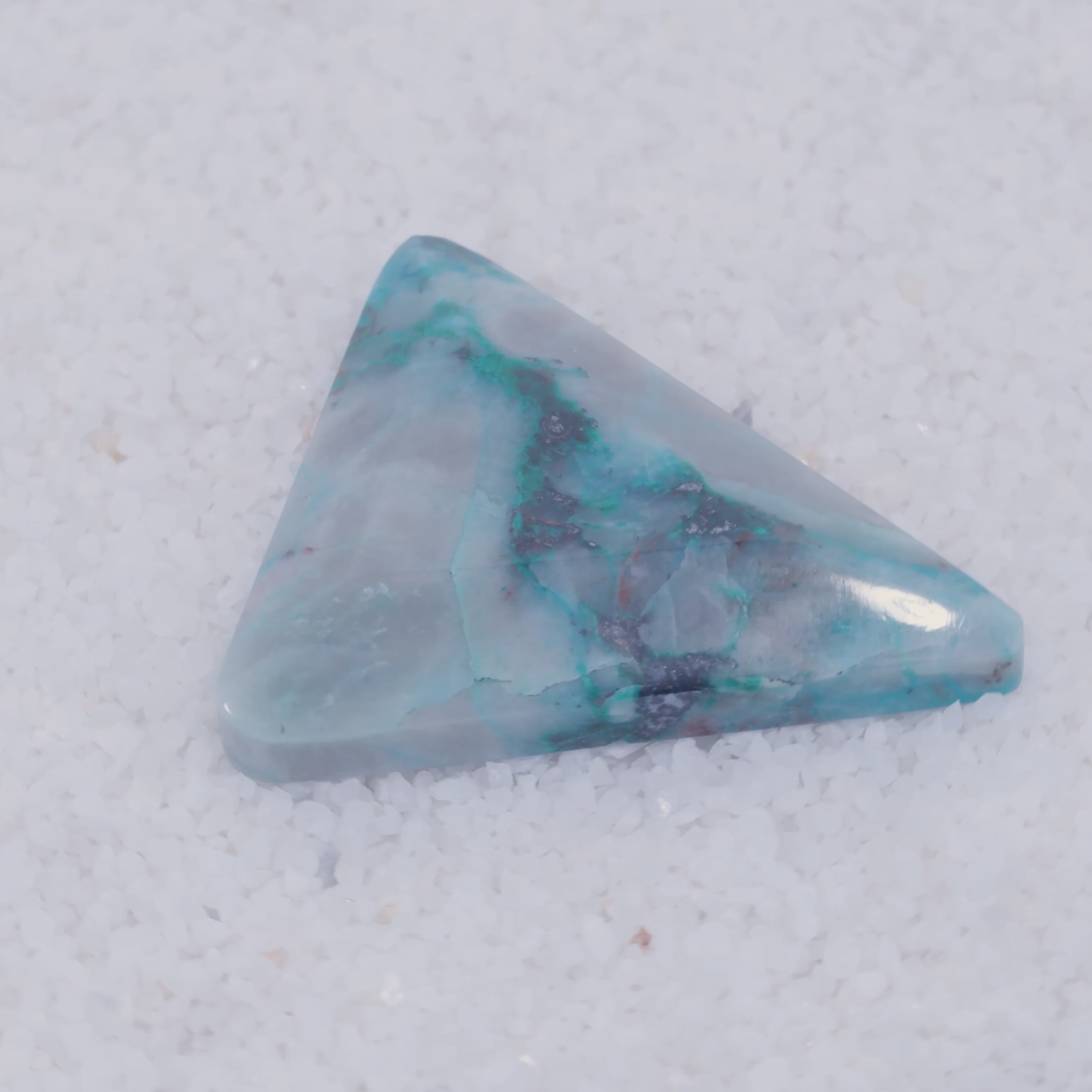 A once-in-a-lifetime rarity from Southern Arizona, this faceted cabochon showcases vivid emerald-green Brochantite crystals, sky-blue Chrysocolla and crimson Cuprite suspended in translucent chalcedony. While Brochantite is sometimes found on quartz or other matrix, it is exceptionally rare included in matrix, especially chalcedony, making this gemstone a one of a kind discovery.