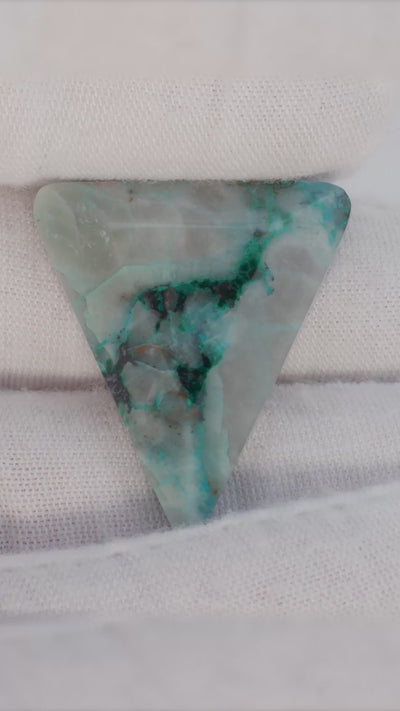 A once-in-a-lifetime rarity from Southern Arizona, this gemstone showcases vibrant emerald-green crystal Brochantite, sky-blue Chrysocolla, and crimson Cuprite, suspended in translucent chalcedony. Brochantite commonly forms as surface crystals. It is a rare occurrence to find Brochantite crystals inside a chalcedony matrix, making this gemstone a one of a kind rarity.