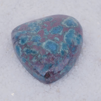 Sourced from a small singular deposit in Southern Arizona, Canyonite Sky is a copper mineral gemstone of unmatched rarity. This cabochon reveals sky-blue Papagoite, teal Ajoite, indigo Shattuckite—three of the world's rarest copper minerals—embedded with crimson Cuprite in a translucent druzy chalcedony matrix.