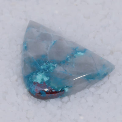 Sourced from a small singular deposit in Southern Arizona, Canyonite Sky is a copper mineral gemstone of unmatched rarity. This cabochon reveals sky-blue Papagoite, teal Ajoite, indigo Shattuckite—three of the world's rarest copper minerals—embedded with crimson Cuprite in a translucent druzy chalcedony matrix.