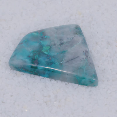 A once-in-a-lifetime rarity from Southern Arizona, this cabochon showcases vivid emerald-green Brochantite crystals, sky-blue Chrysocolla and crimson Cuprite suspended in translucent chalcedony. While Brochantite is sometimes found on quartz or other matrix, it is exceptionally rare included in matrix, especially chalcedony, making this gemstone a one of a kind discovery.