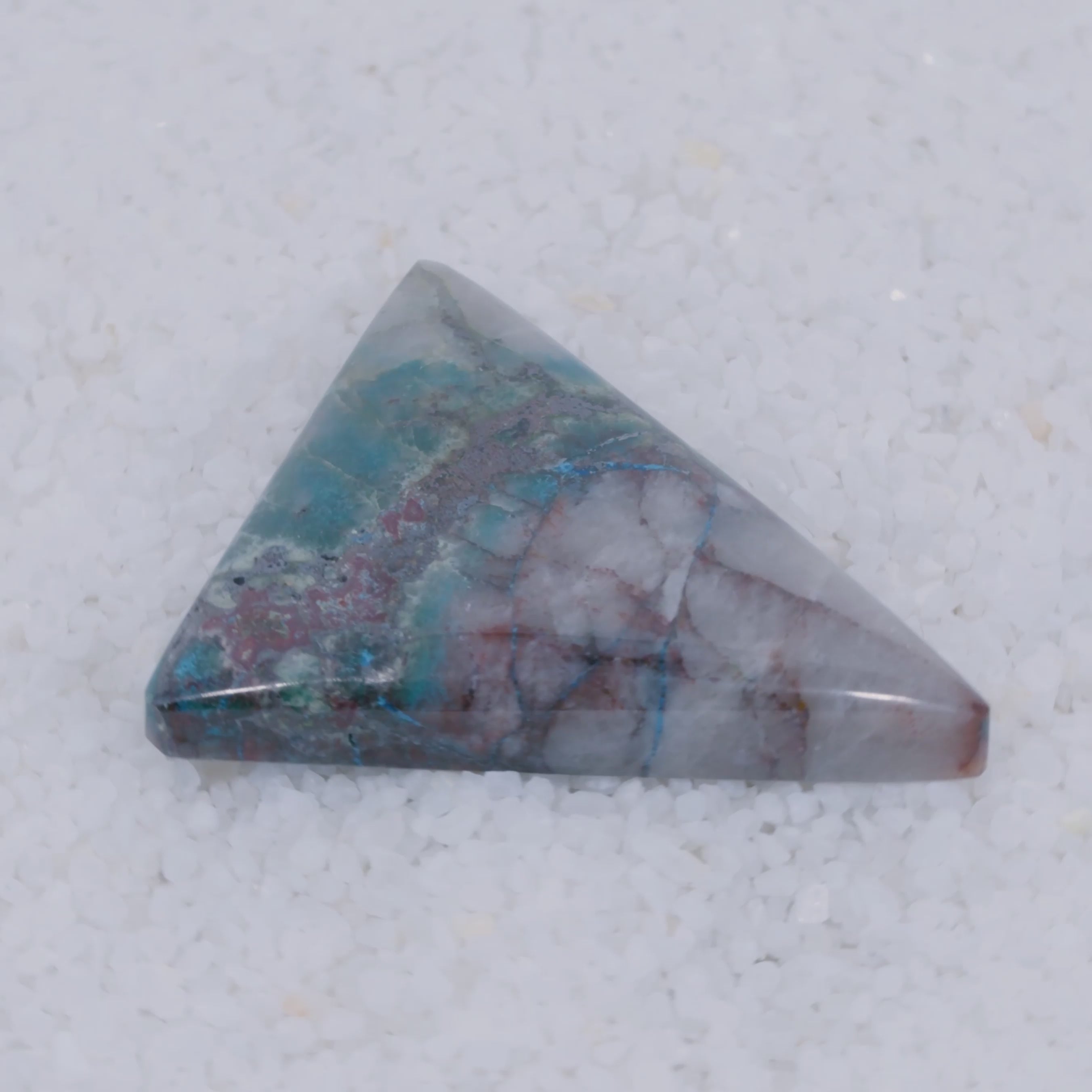 Sourced from a small singular deposit in Southern Arizona, Canyonite Sky is a copper mineral gemstone of unmatched rarity. This cabochon reveals sky-blue Papagoite, teal Ajoite, indigo Shattuckite—three of the world's rarest copper minerals—embedded with crimson Cuprite in a translucent druzy chalcedony matrix.