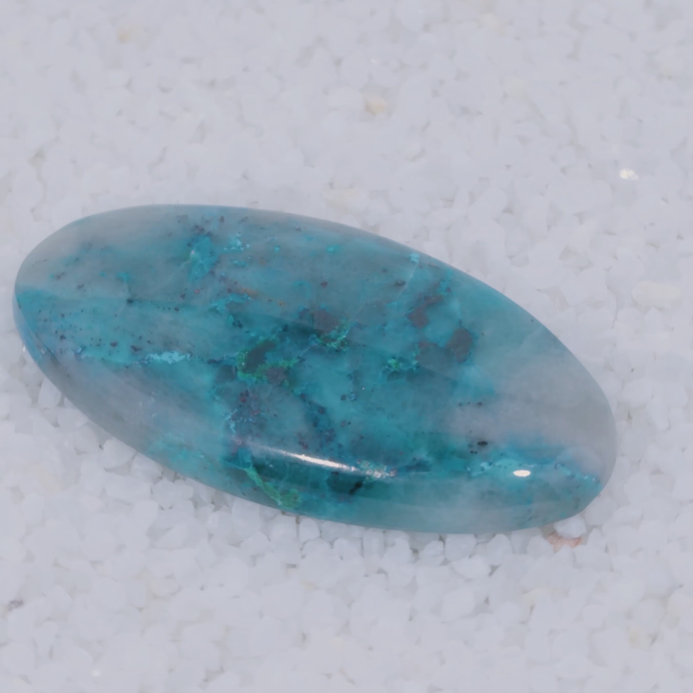 A once-in-a-lifetime rarity from Southern Arizona, this cabochon showcases vivid emerald-green Brochantite crystals, sky-blue Chrysocolla and crimson Cuprite suspended in translucent chalcedony. While Brochantite is sometimes found on quartz or other matrix, it is exceptionally rare included in matrix, especially chalcedony, making this gemstone a one of a kind discovery.