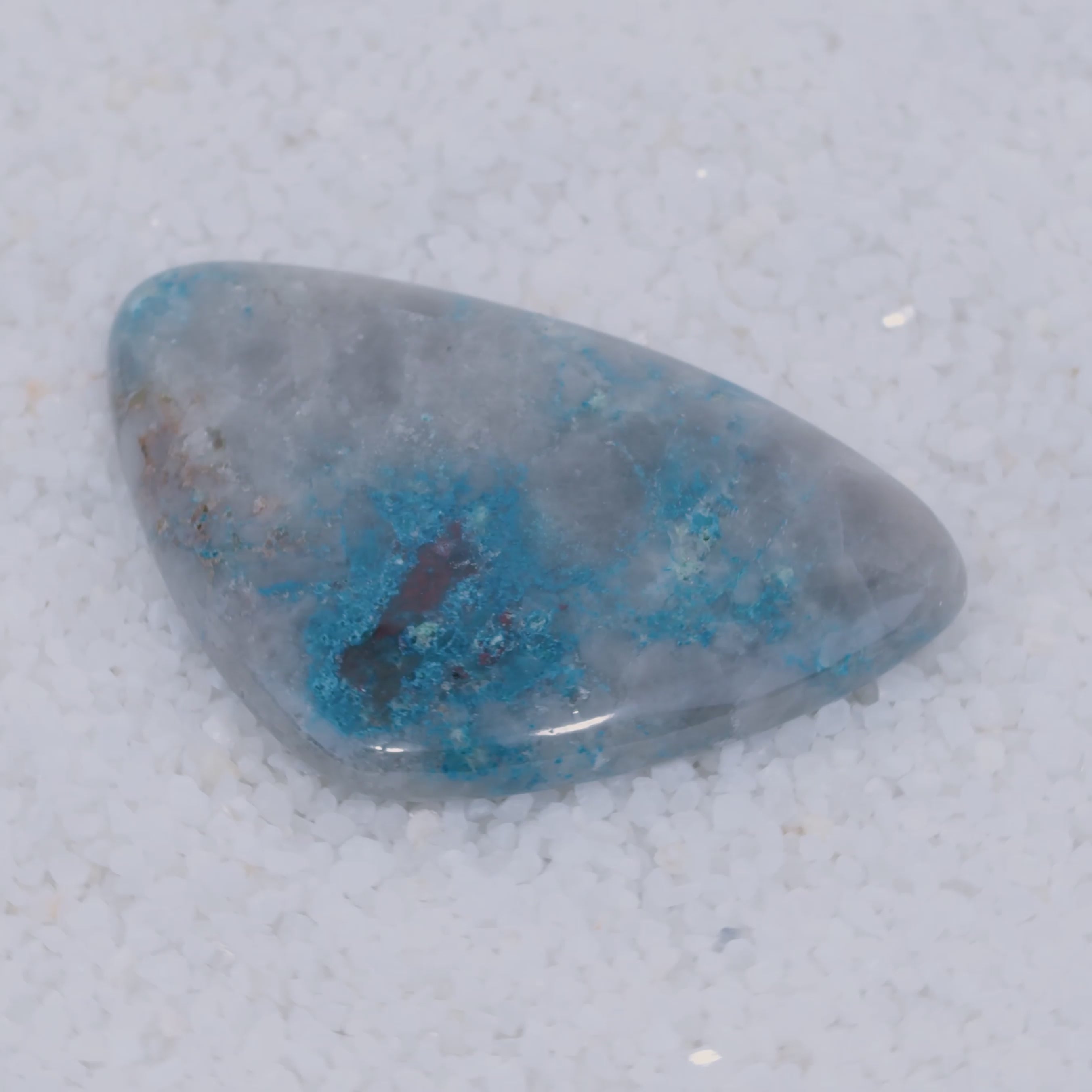 Sourced from a small singular deposit in Southern Arizona, Canyonite Sky is a copper mineral gemstone of unmatched rarity. This cabochon reveals sky-blue Papagoite, teal Ajoite, indigo Shattuckite—three of the world's rarest copper minerals—embedded with crimson Cuprite in a translucent druzy chalcedony matrix.
