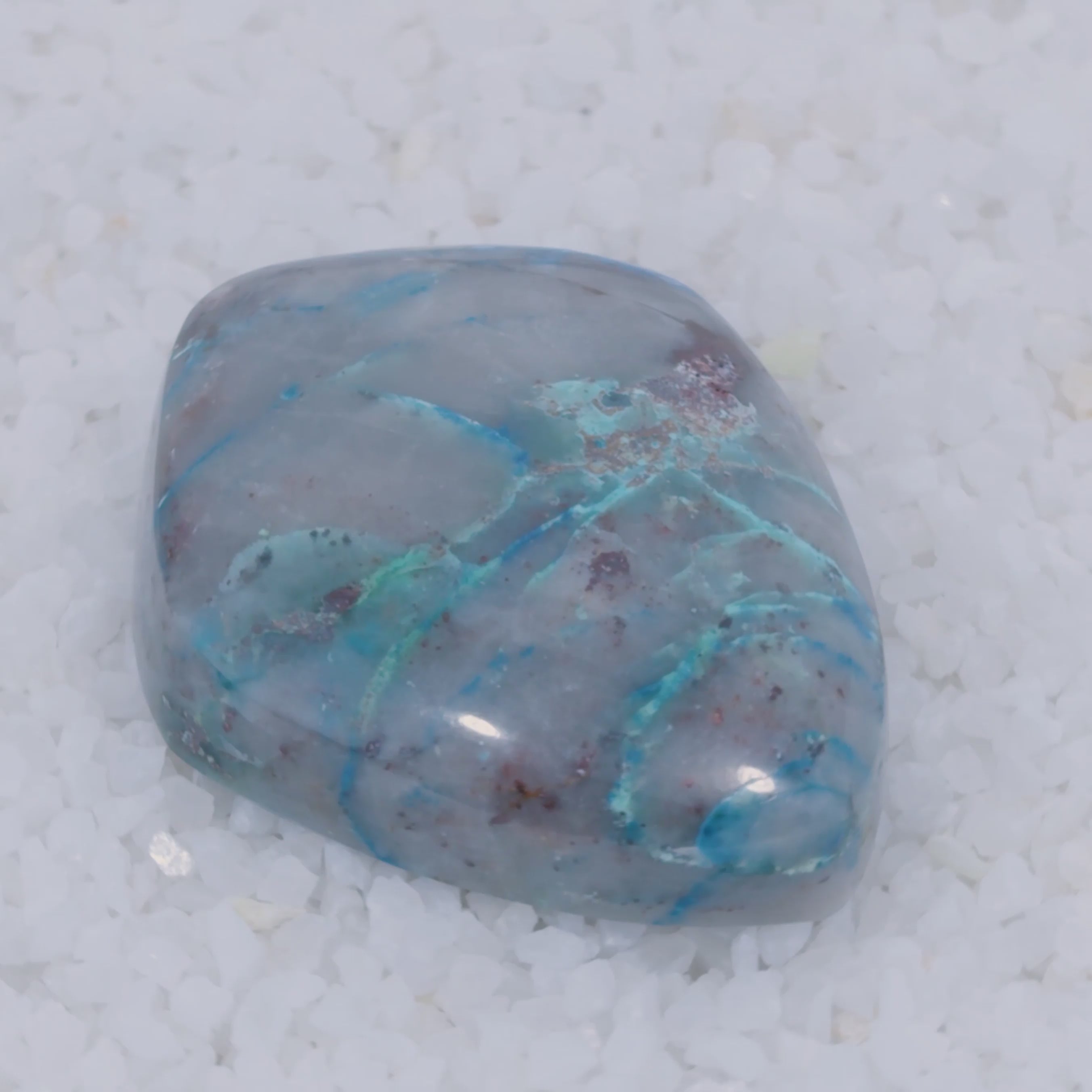 Sourced from a small singular deposit in Southern Arizona, Canyonite Sky is a copper mineral gemstone of unmatched rarity. This cabochon reveals sky-blue Papagoite, teal Ajoite, indigo Shattuckite—three of the world's rarest copper minerals—embedded with crimson Cuprite in a translucent druzy chalcedony matrix.