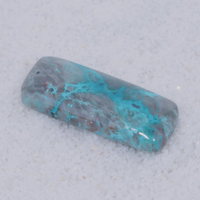 A once-in-a-lifetime rarity from Southern Arizona, this cabochon showcases vivid emerald-green Brochantite crystals, sky-blue Chrysocolla and crimson Cuprite suspended in translucent chalcedony. While Brochantite is sometimes found on quartz or other matrix, it is exceptionally rare included in matrix, especially chalcedony, making this gemstone a one of a kind discovery.