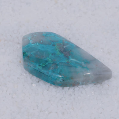 A once-in-a-lifetime rarity from Southern Arizona, this cabochon showcases vivid emerald-green Brochantite crystals, sky-blue Chrysocolla and crimson Cuprite suspended in translucent chalcedony. While Brochantite is sometimes found on quartz or other matrix, it is exceptionally rare included in matrix, especially chalcedony, making this gemstone a one of a kind discovery.