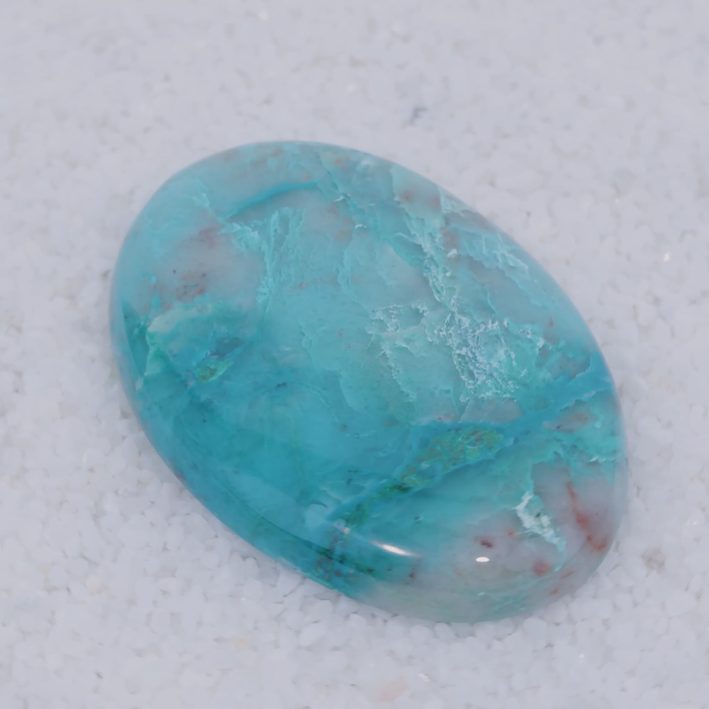 A once-in-a-lifetime rarity from Southern Arizona, this cabochon showcases vivid emerald-green Brochantite crystals, sky-blue Chrysocolla and crimson Cuprite suspended in translucent chalcedony. While Brochantite is sometimes found on quartz or other matrix, it is exceptionally rare included in matrix, especially chalcedony, making this gemstone a one of a kind discovery.