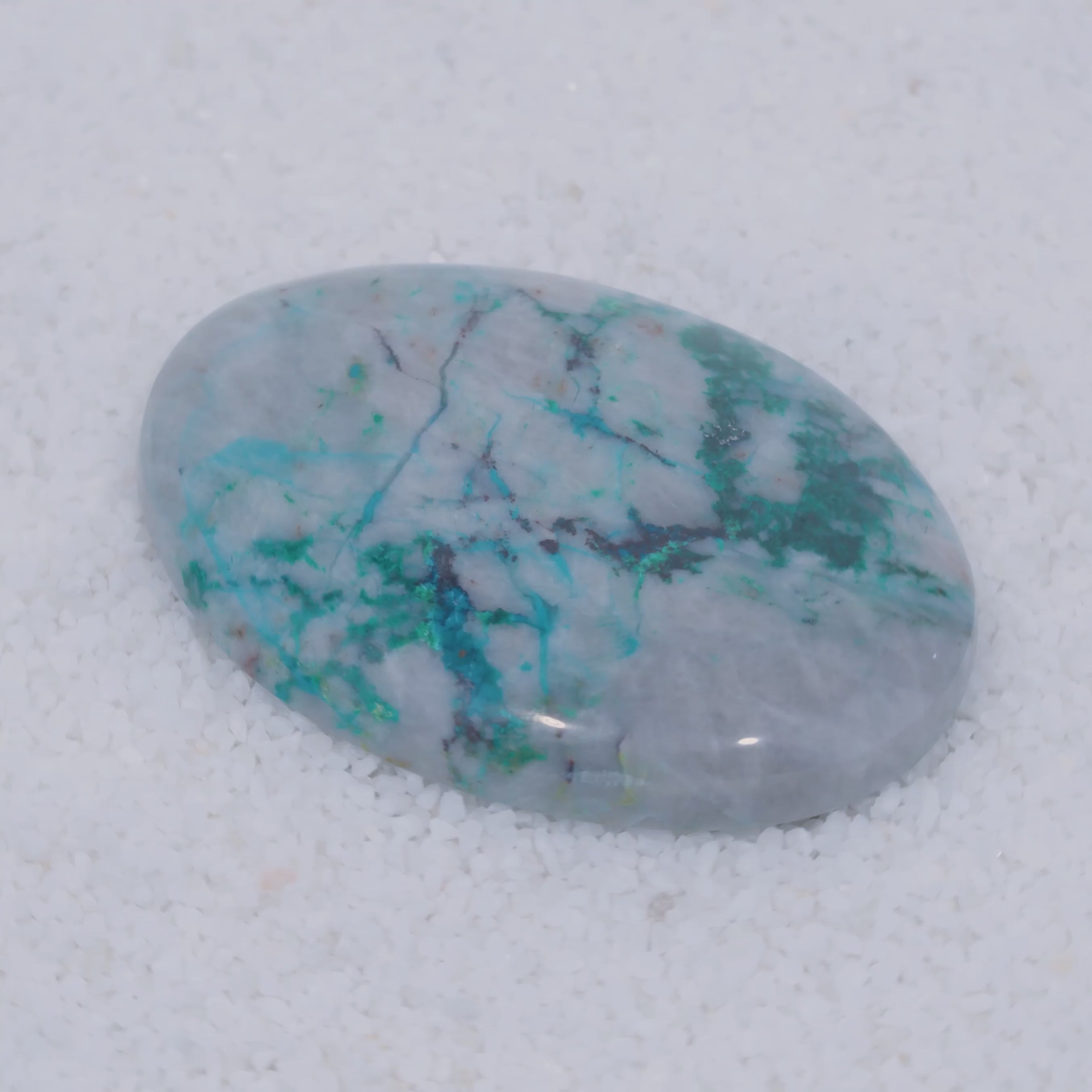 A once-in-a-lifetime rarity from Southern Arizona, this cabochon showcases vivid emerald-green Brochantite crystals, sky-blue Chrysocolla and crimson Cuprite suspended in translucent chalcedony. While Brochantite is sometimes found on quartz or other matrix, it is exceptionally rare included in matrix, especially chalcedony, making this gemstone a one of a kind discovery.