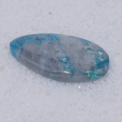 Sourced from a small singular deposit in Southern Arizona, Canyonite Sky is a copper mineral gemstone of unmatched rarity. This cabochon reveals sky-blue Papagoite, teal Ajoite, indigo Shattuckite—three of the world's rarest copper minerals—embedded with crimson Cuprite in a translucent druzy chalcedony matrix.