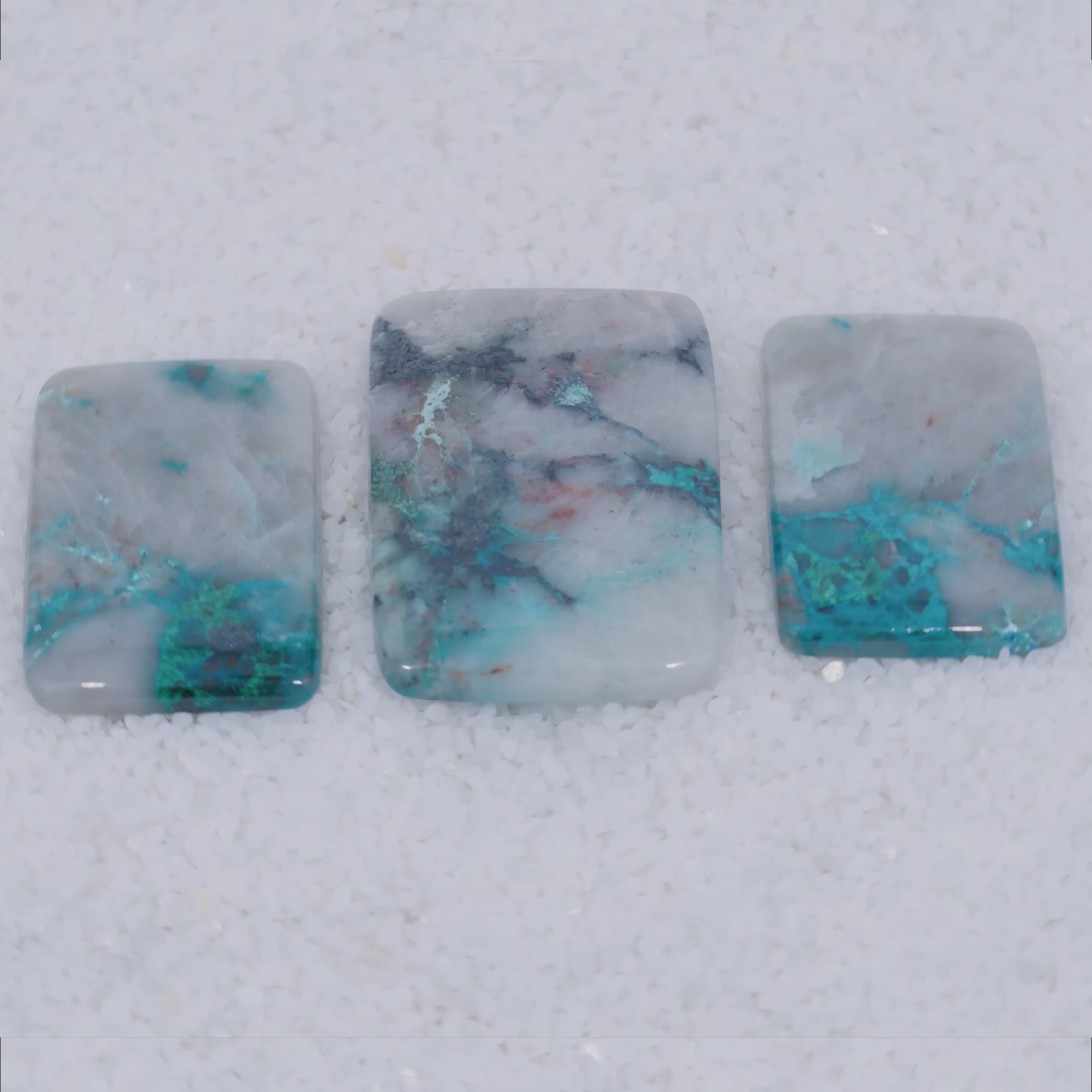 A once-in-a-lifetime rarity from Southern Arizona, this cabochon showcases vivid emerald-green Brochantite crystals, sky-blue Chrysocolla and crimson Cuprite suspended in translucent chalcedony. While Brochantite is sometimes found on quartz or other matrix, it is exceptionally rare included in matrix, especially chalcedony, making these gemstones a one of a kind discovery.