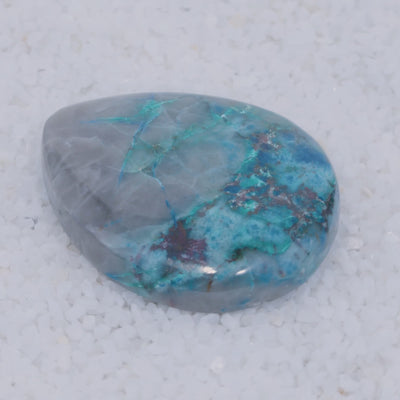 Sourced from a small singular deposit in Southern Arizona, Canyonite Sky is a copper mineral gemstone of unmatched rarity. This cabochon reveals sky-blue Papagoite, teal Ajoite, indigo Shattuckite—three of the world's rarest copper minerals—embedded with crimson Cuprite in a translucent druzy chalcedony matrix.