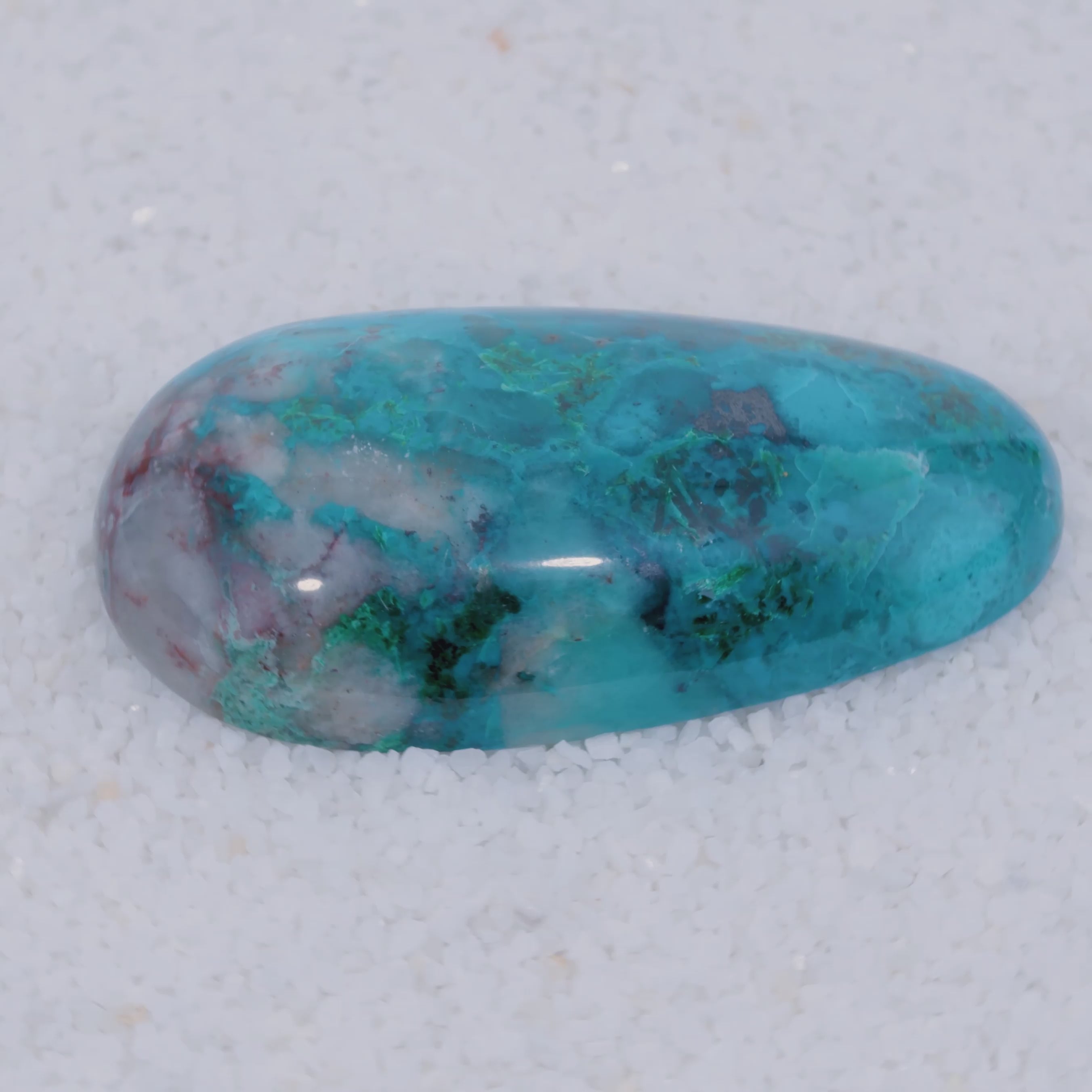 A once-in-a-lifetime rarity from Southern Arizona, this cabochon showcases vivid emerald-green Brochantite crystals, sky-blue Chrysocolla and crimson Cuprite suspended in translucent chalcedony. While Brochantite is sometimes found on quartz or other matrix, it is exceptionally rare included in matrix, especially chalcedony, making this gemstone a one of a kind discovery.