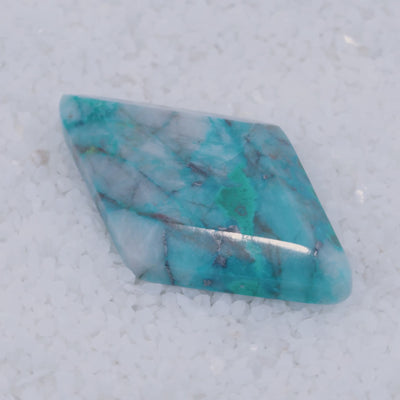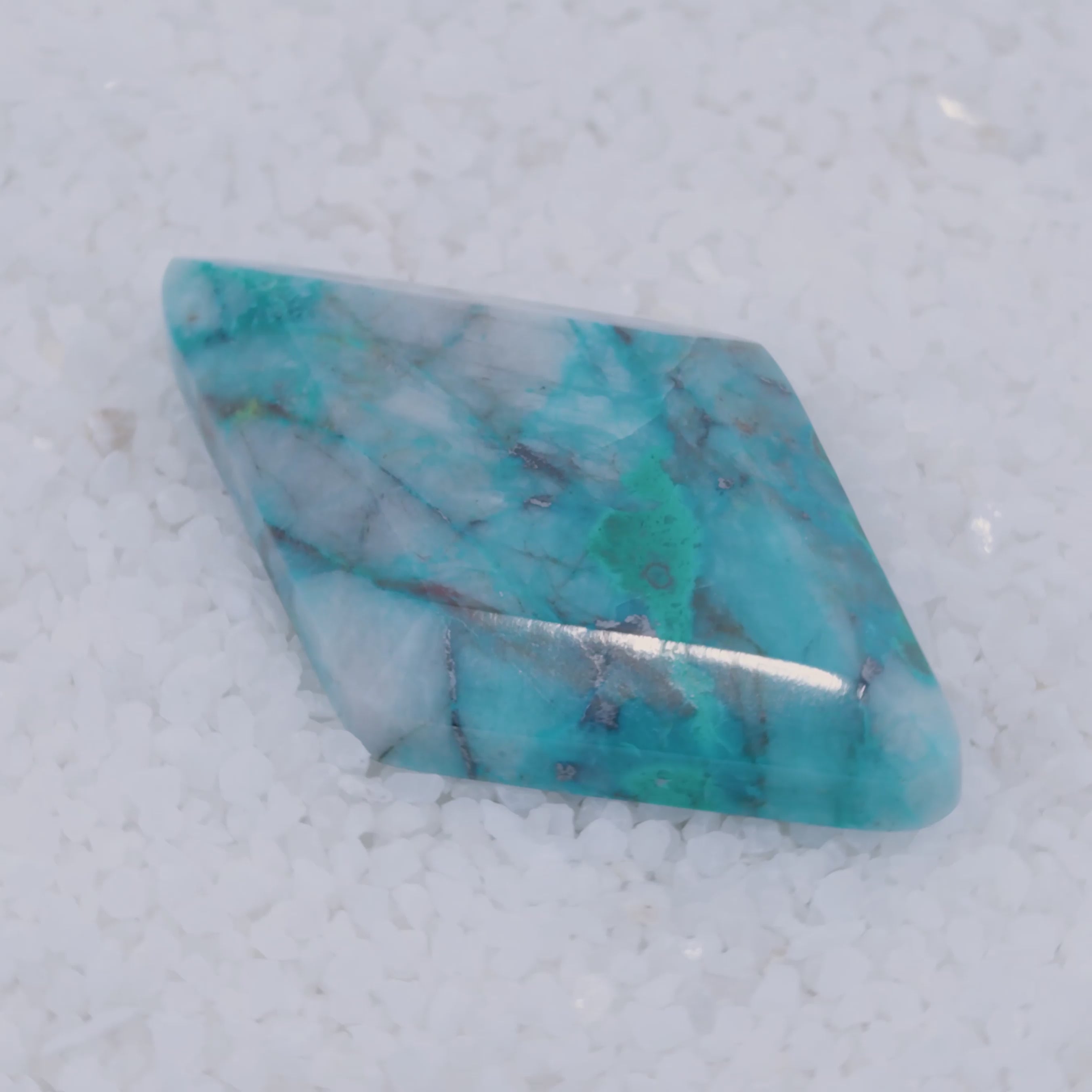 A once-in-a-lifetime rarity from Southern Arizona, this cabochon showcases vivid emerald-green Brochantite crystals, sky-blue Chrysocolla and crimson Cuprite suspended in translucent chalcedony. While Brochantite is sometimes found on quartz or other matrix, it is exceptionally rare included in matrix, especially chalcedony, making this gemstone a one of a kind discovery.