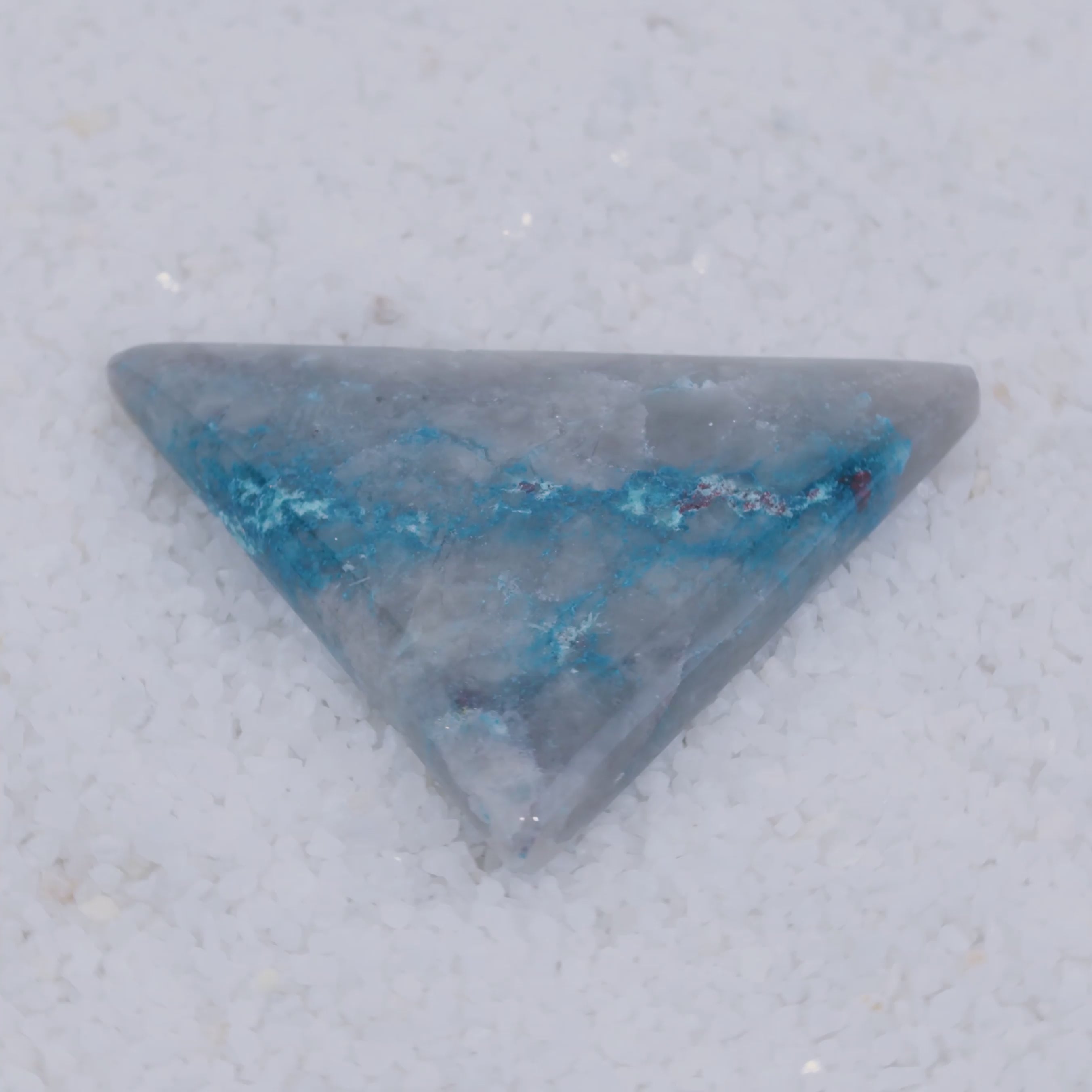 Canyonite Sky 37ct triangular cabochon with vivid Papagoite and Ajoite inclusions — a rare Arizona collector gemstone for artisan jewelers.