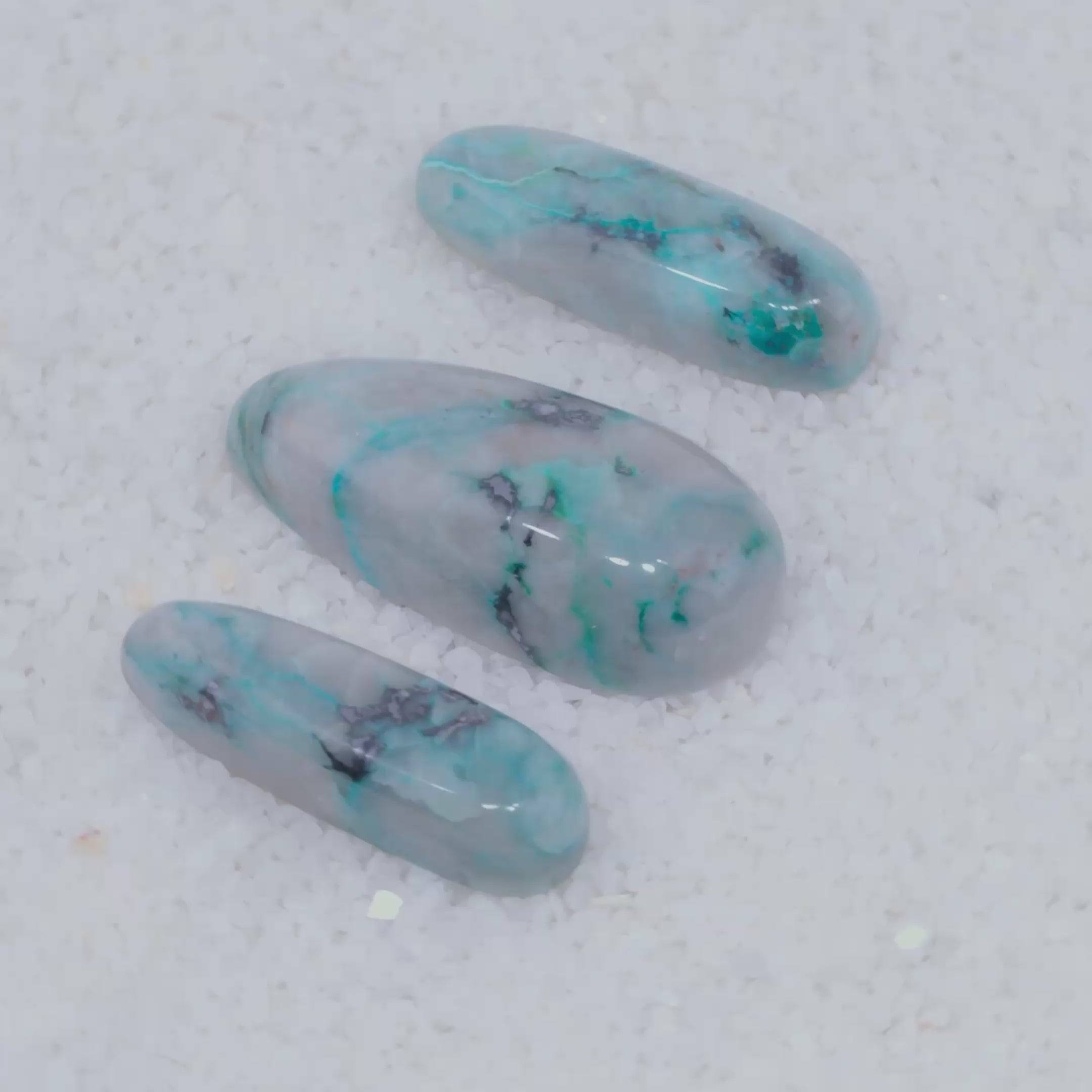 A once-in-a-lifetime rarity from Southern Arizona, this Gemstone set showcases vibrant emerald-green crystal Brochantite, teal crystal Ajoite and sky-blue Chrysocolla, suspended in translucent chalcedony. Brochantite commonly forms as surface crystals. It is a rare occurrence to find Brochantite and Ajoite inside a chalcedony matrix, making this gemstone set a one of a kind rarity.