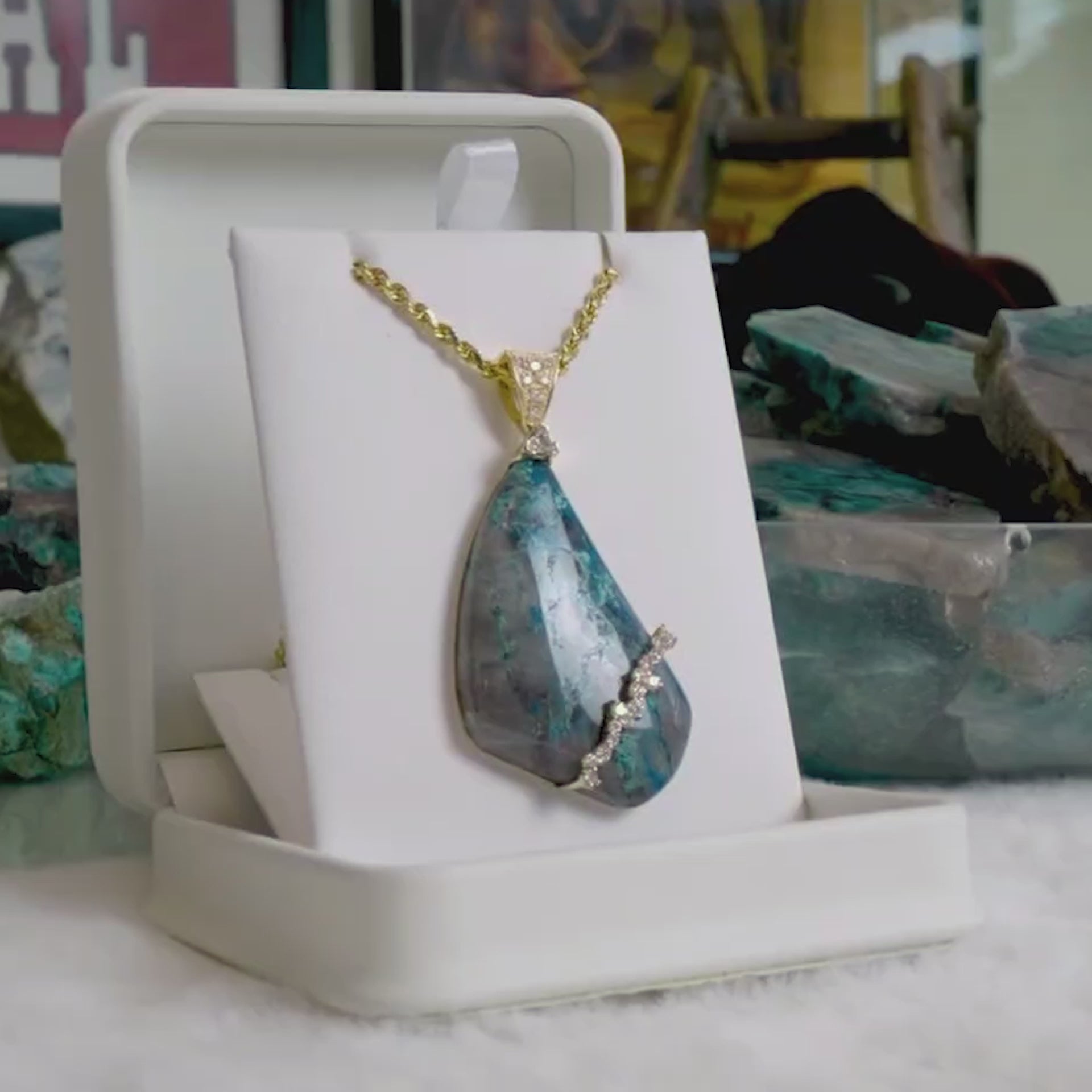 This one of one, one of a kind, Museum Grade ultra rare 45.55ct Papagoite, Ajoite, and Shattuckite collector grade Canyonite Sky gemstone is set in solid 14k yellow gold and features .47ct tw SI2 natural diamonds and is suspended by a 2.5mm 10.5 gram solid 14k gold rope chain.